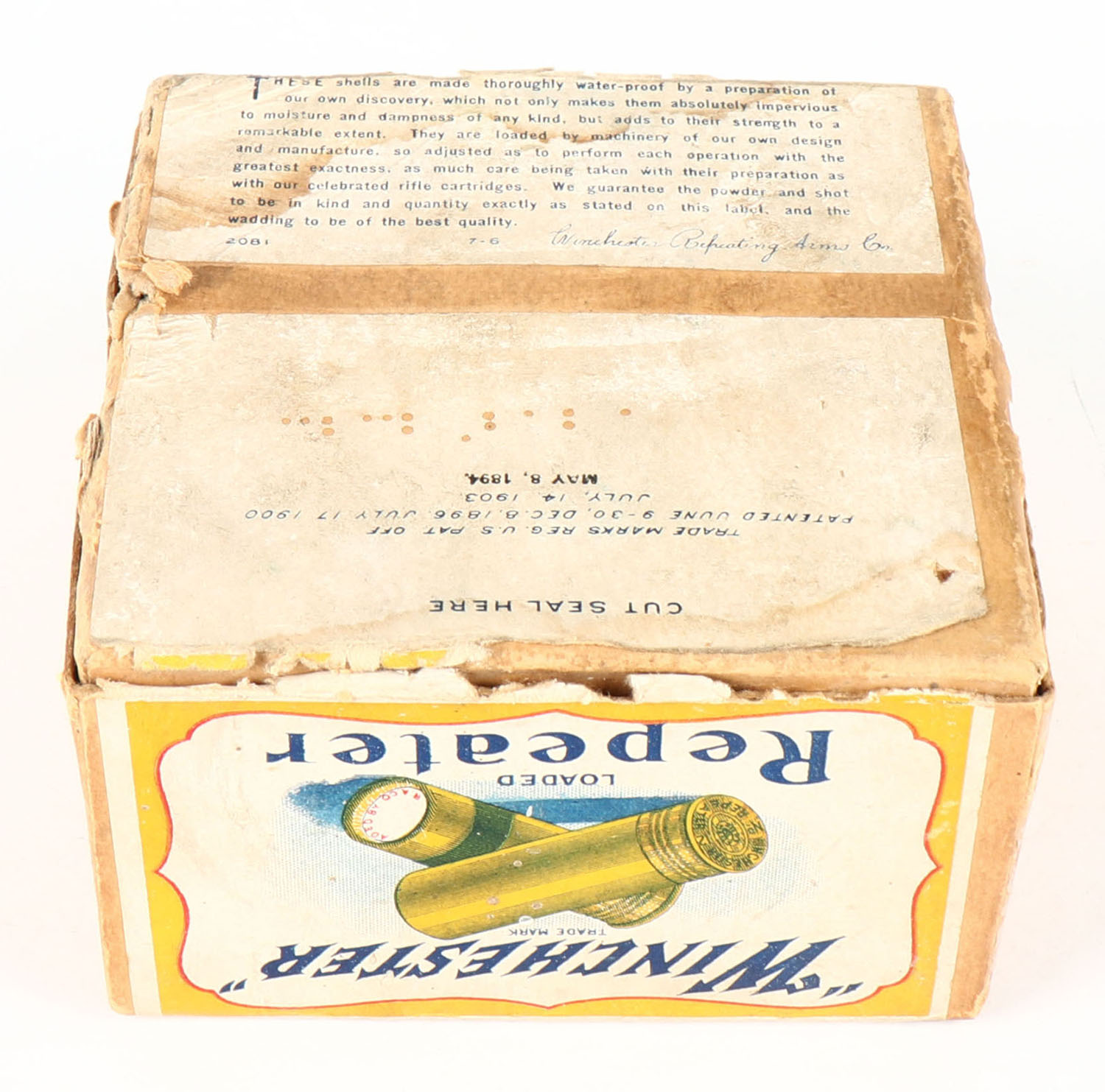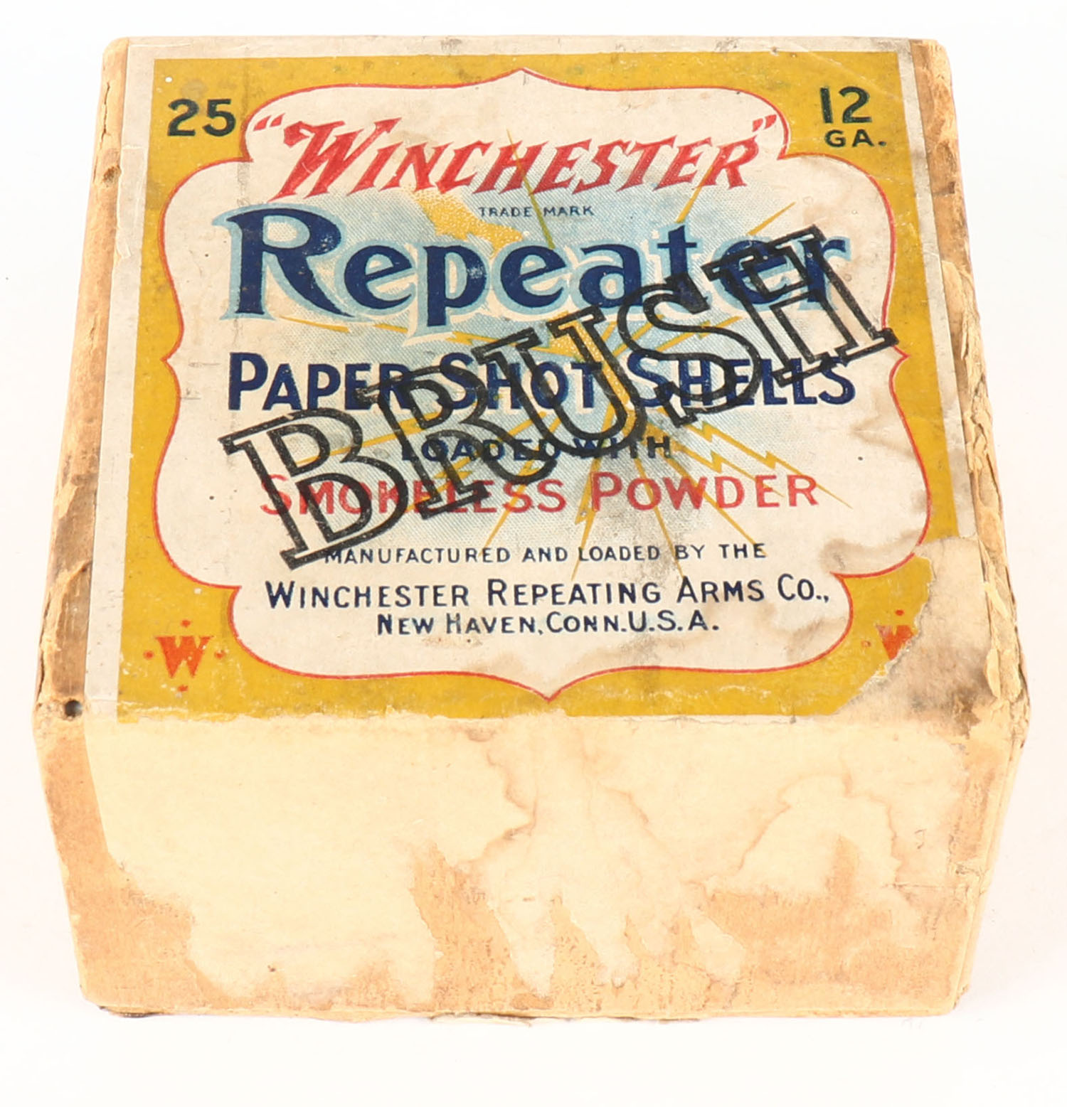Winchester, REPEATER, 12ga, 2pc., Empty, shot size unknown, buff box with yellow, white & red label showing lightning bolt, box has overstamp '' BRUSH'', box is missing side label, has age soiling with scuffing. Grade: Good ++ - Value: 20 to 100