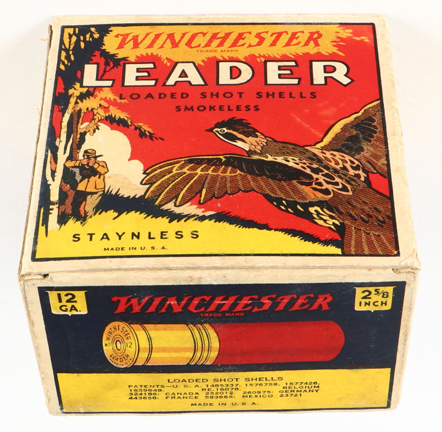Winchester, LEADER QUAIL BOX, 12ga., 1pc., Partial 16rds, shot size 6 Chilled, multi colored box with flying Quail & hunter in background, Staynless, 2 5/8'', Loading: 3 1/4 Drams 1 1/8 Oz. 6 Chilled Shot, box is solid with small edge wear on right side, has great colors, paper shells are excellent. Grade: Excellent + - Value: 600 to 1000
