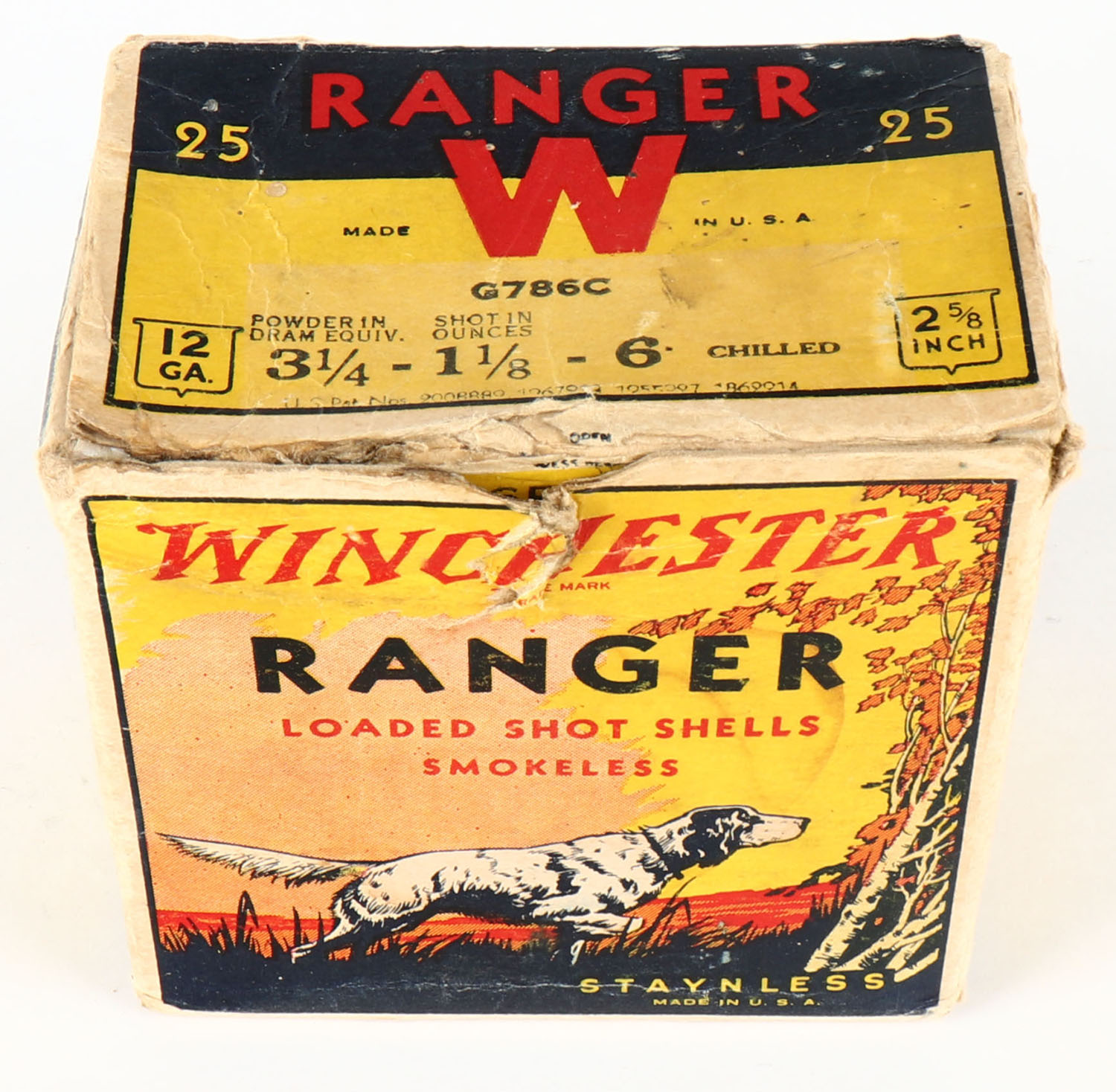Winchester, Ranger, 12ga, 1pc., Empty, Shot Size 6Ch., multi colored box, dog on point, 2 5/8'', box has age soiling & scuffing. Grade: Good ++ - Value: 20 to 60