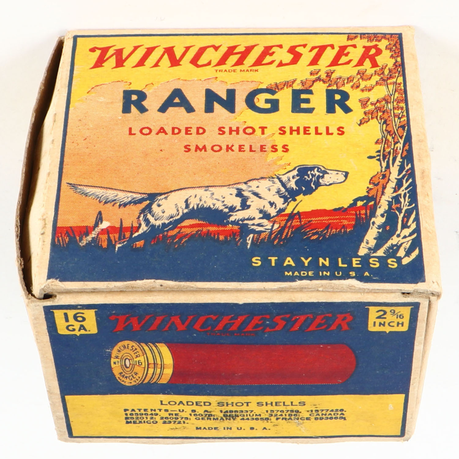 Winchester, Ranger, 16ga, 1pc., Full, shot size 8, multi-colored box, dog on point, 2 9/16'', box has a seam split with minor scuffing, paper shells are excellent. Grade: Excellent - Value: 40 to 100