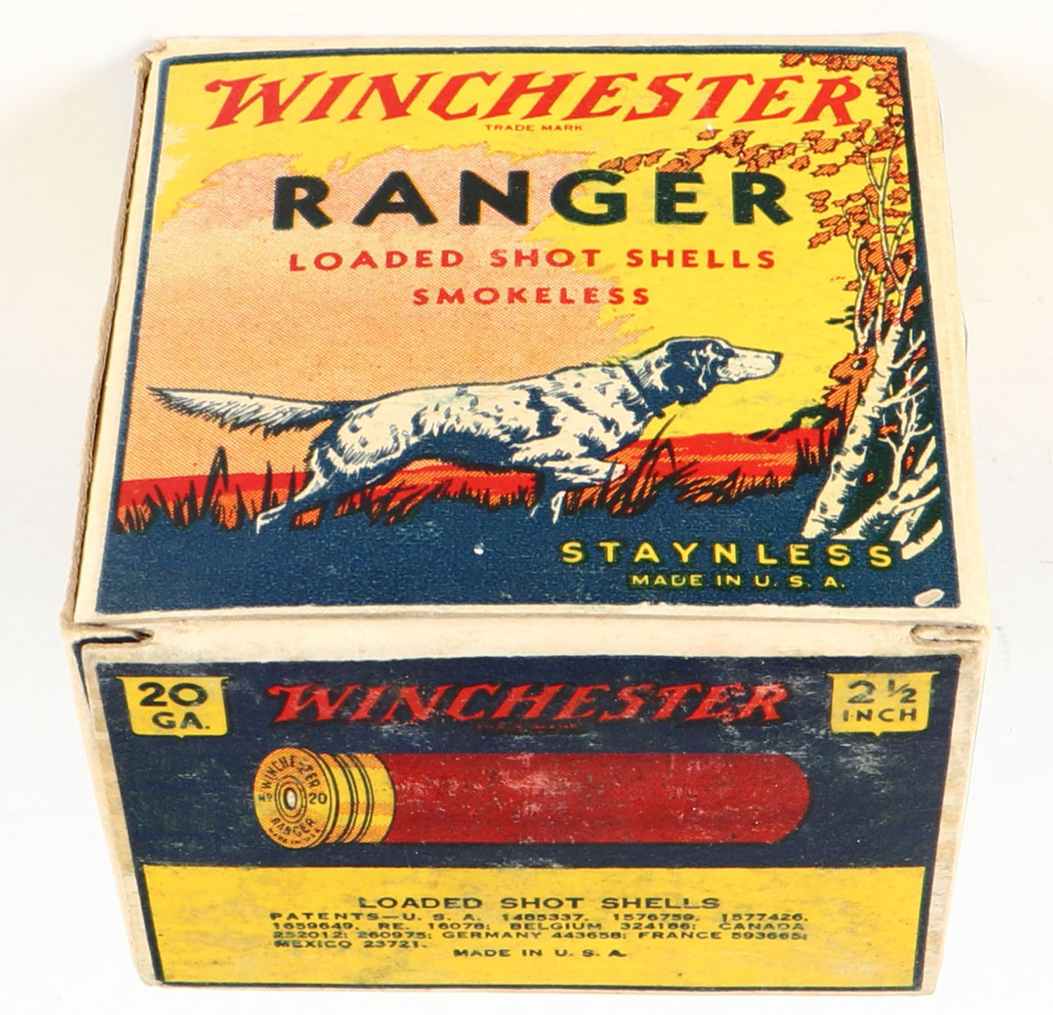 Winchester, Ranger, 20ga, 1pc., Full, shot size 7 1/2Ch, multi colored box, dog on point, shells 2 1/2'', box is very solid with excellent colors, paper shells are excellent. Grade: Excellent + - Value: 40 to 120