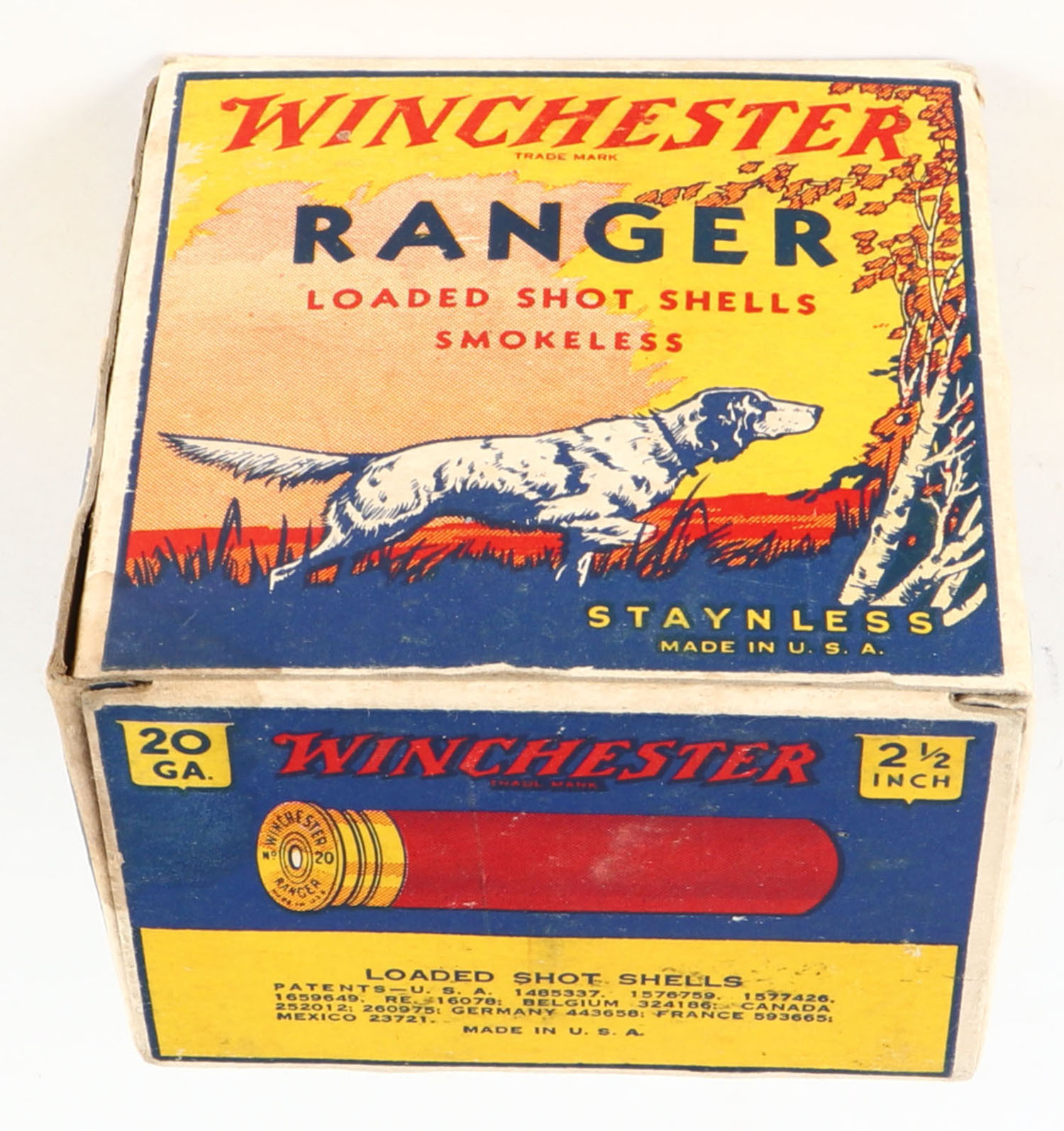 Winchester, Ranger, 20ga, 1pc., 2 1/2'', Empty, Shot Size 6, multi colored box with dog on point, box has light edge wear & light scuffing with great colors. Grade: Very Good ++ - Value: 20 to 80