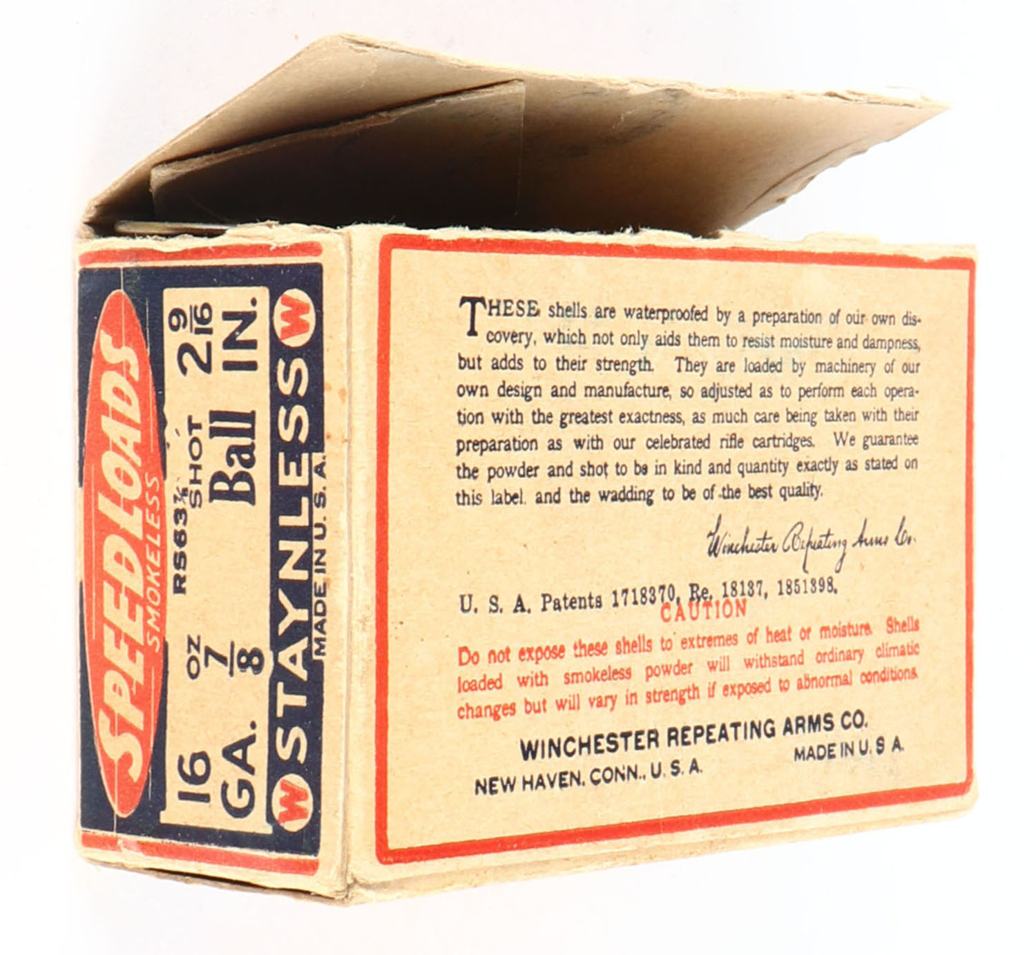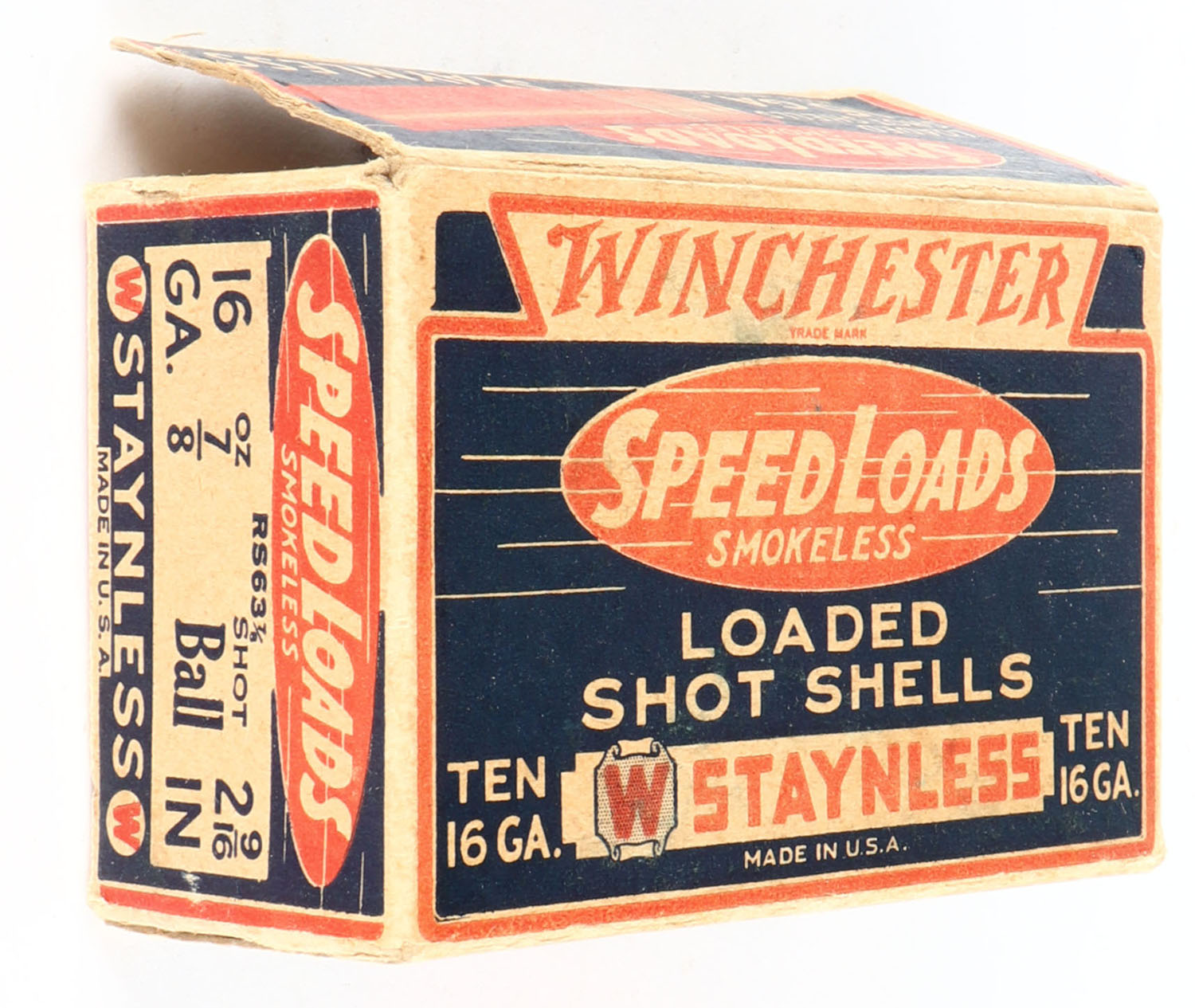 RARE! Winchester, Speed Loads, STAYNLESS, 16ga, 1pc., Partial 8rds, shot size Ball, Buff, red and blue box, 2 9/16'', box has a partial seam split, paper shells are very good. Grade: Very Good - Value: 100 to 400