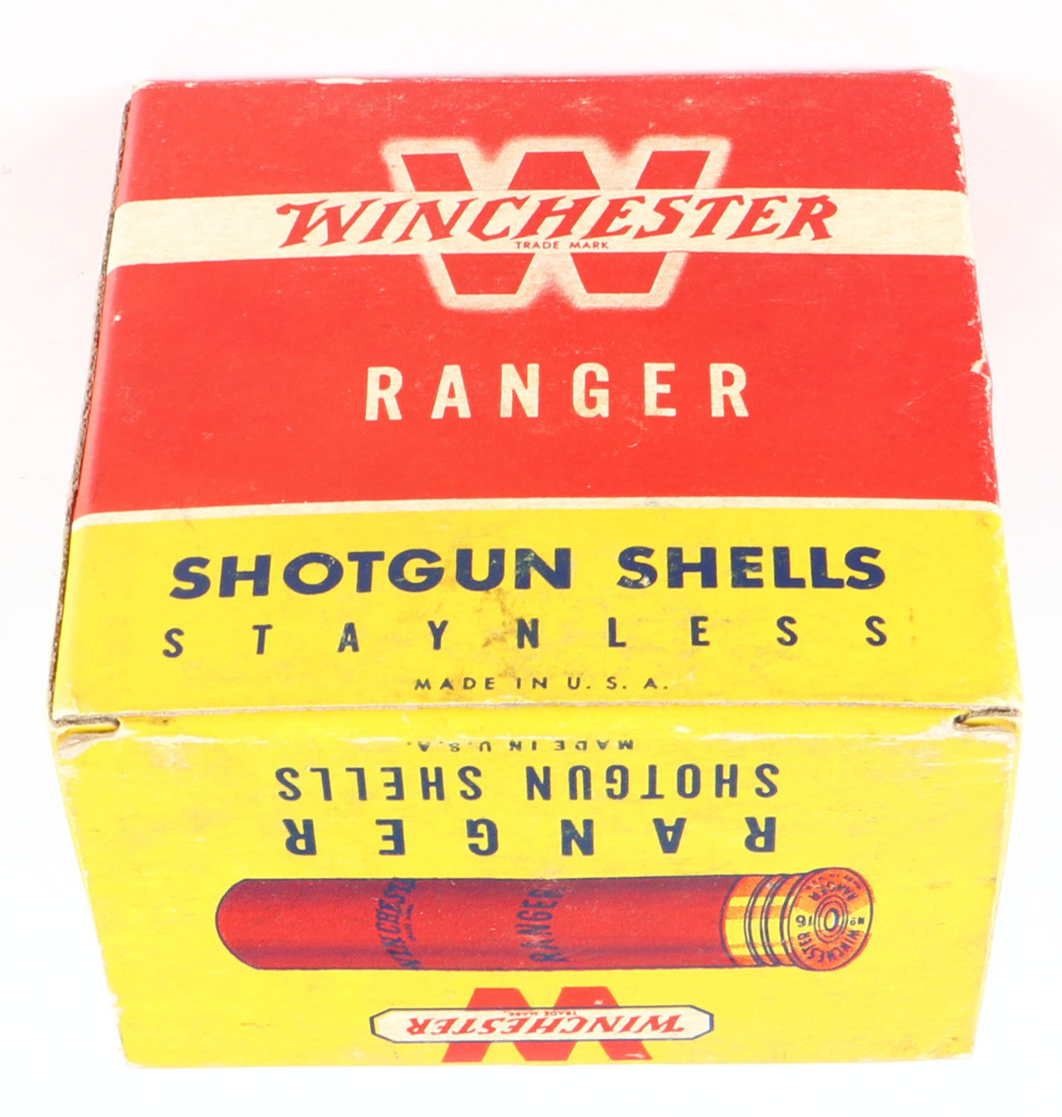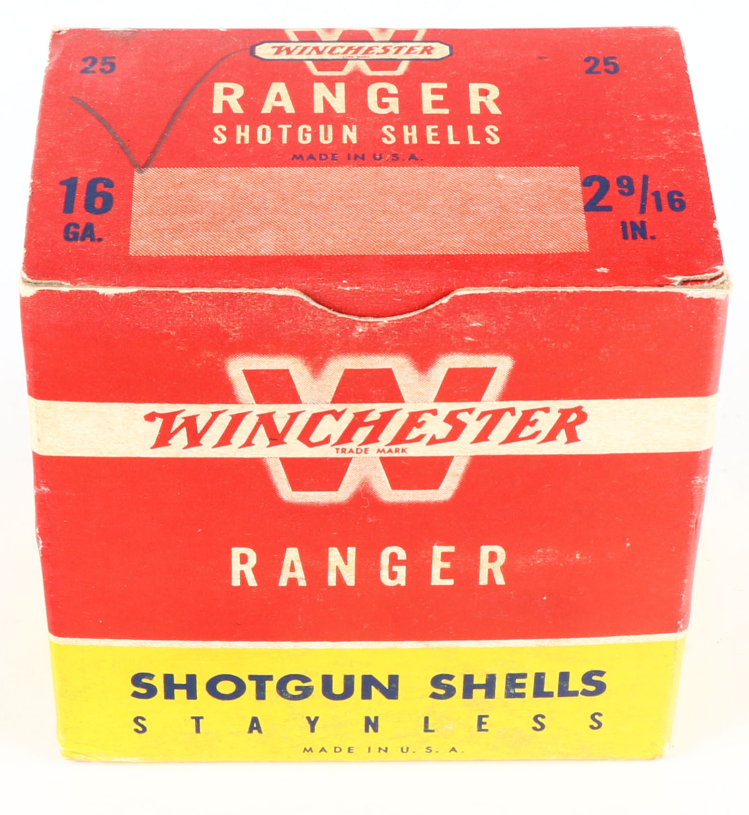 Winchester, Ranger, 16ga., 2 9/16'', 1pc., Full, shot size 5, Red, white & yellow box, box is very solid, paper shells are excellent. Grade: Excellent + - Value: 10 to 40