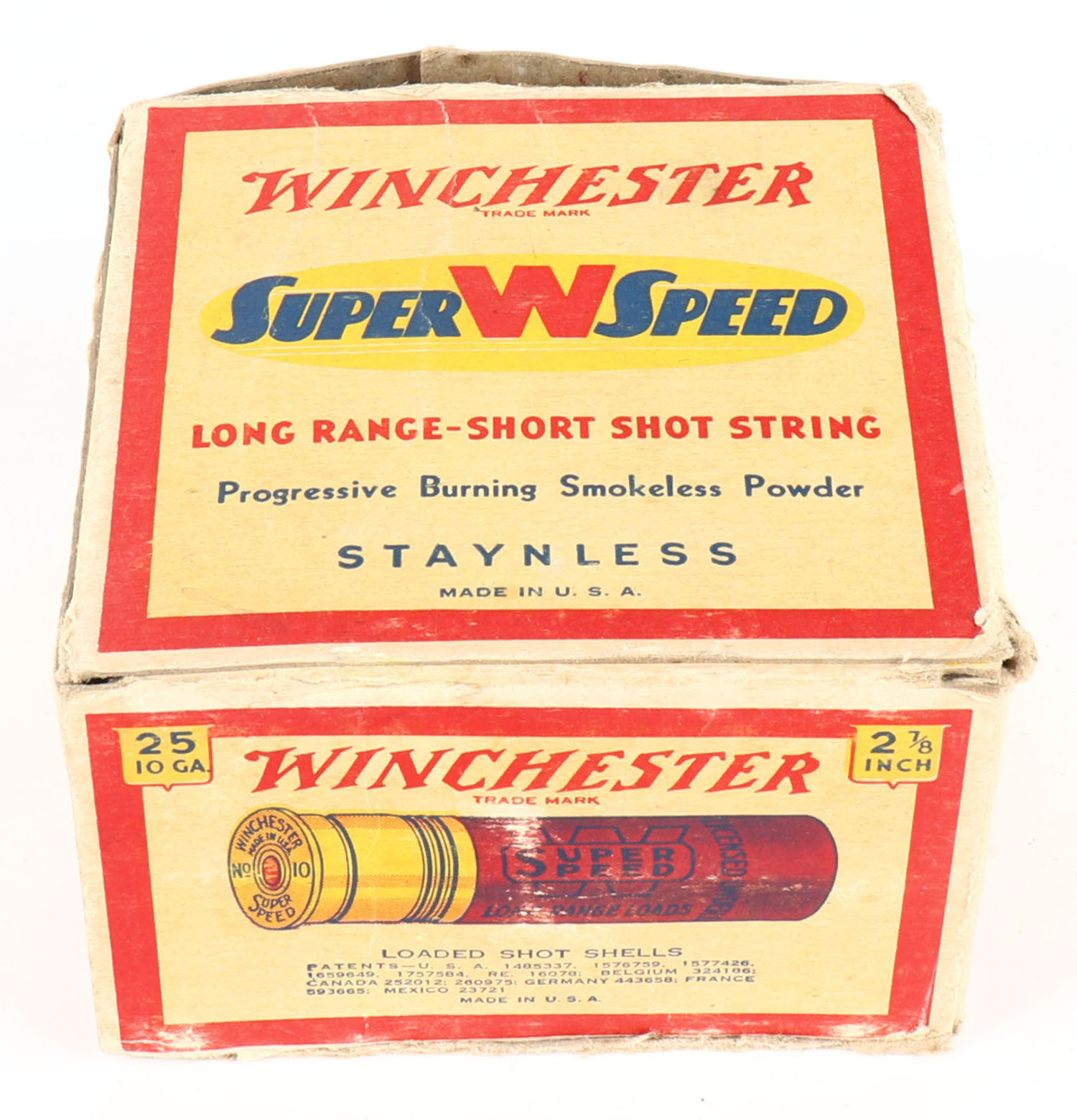 Winchester, Super W Speed, Staynless, 10ga., 2 7/8'', 1pc., Full, shot size 4, cream red, blue and yellow box, box is solid with very nice colors, box is missing top flap, paper shells are excellent. Grade: Very Good - Value: 20 to 100