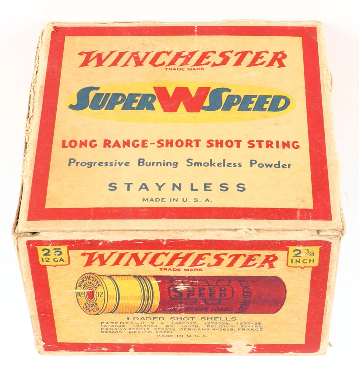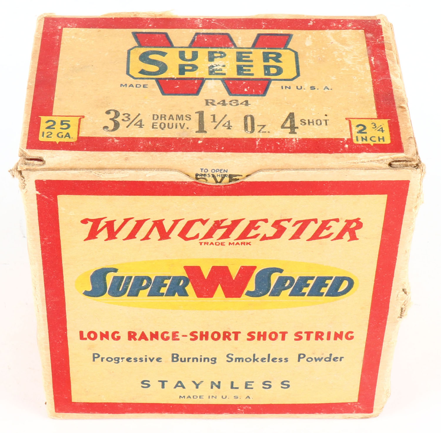 Winchester, Super W Speed, Staynless, 12ga., 2 3/4'', 1pc., Full, shot size 4, cream red, blue and yellow box, box has light shell protrusion & light scuffing, paper shells are excellent. Grade: Very Good - Value: 20 to 60