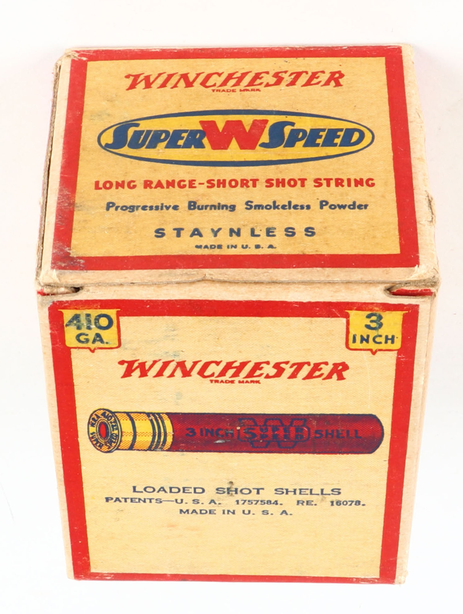 Winchester, Super W Speed, 410ga., Staynless, 3'', 1pc., Full, shot size 9 Skeet Load, cream, red, blue and yellow box, box has minor edge wear, paper shells are excellent. Grade: Excellent - Value: 20 to 60