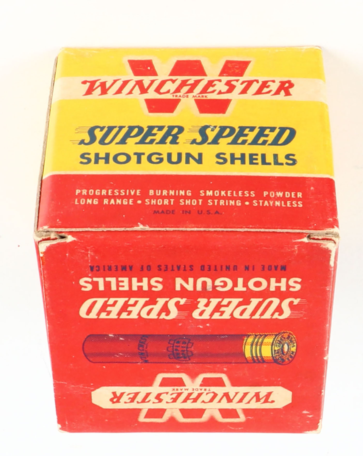 Winchester, Super Speed, 410ga., 2 1/2'', 1pc., Full, shot size 7 1/2, red, black and yellow box, box is very solid, paper shells are minty. Grade: Excellent + - Value: 10 to 40