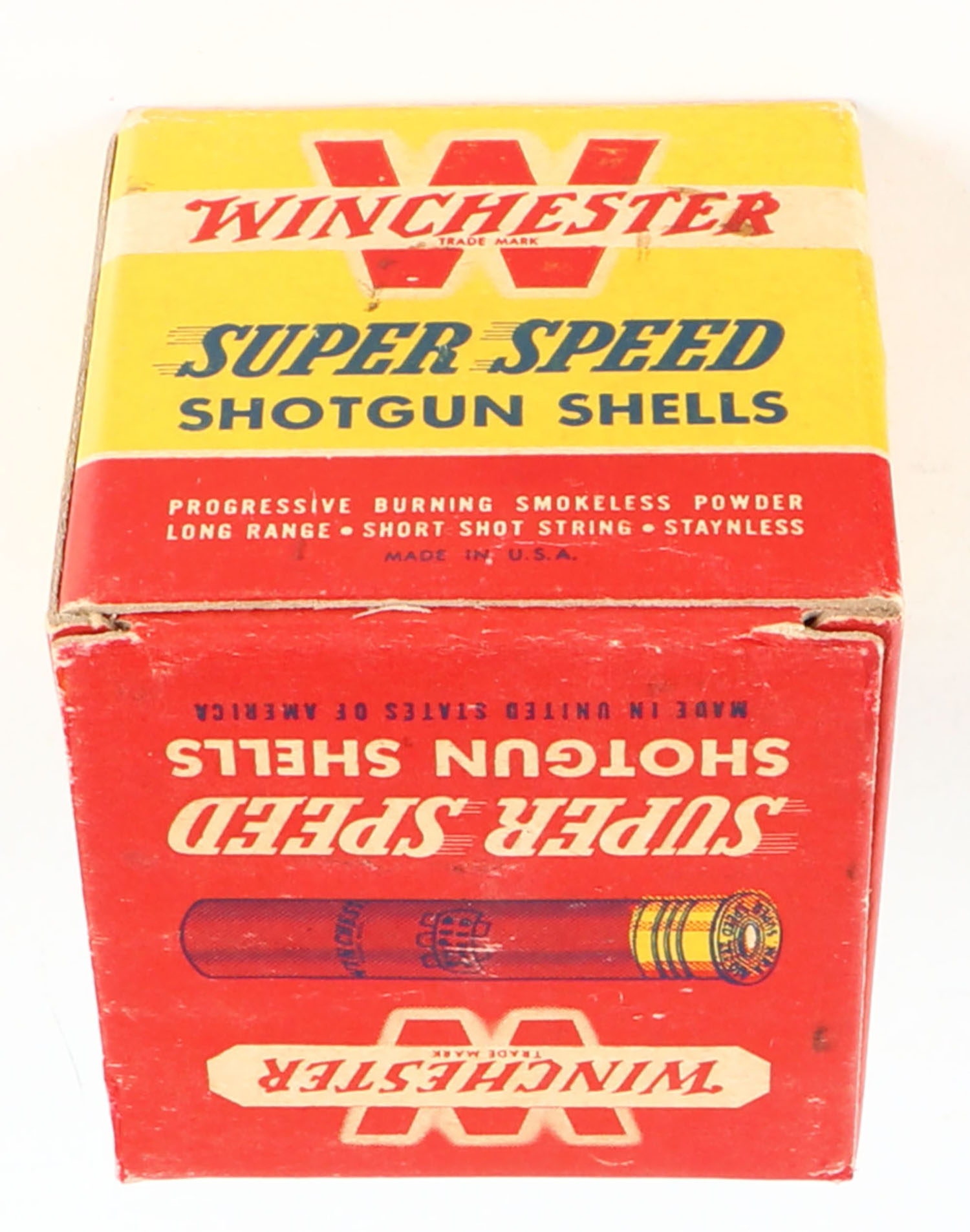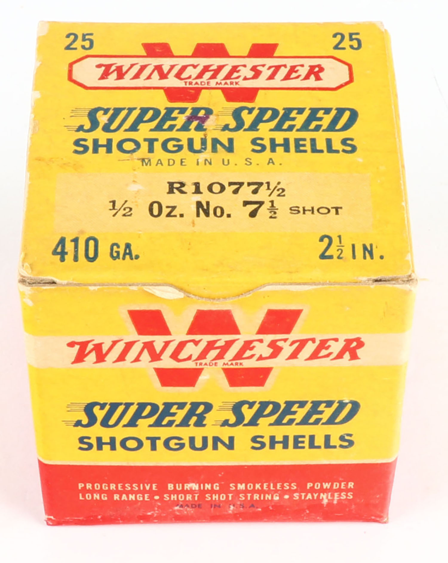 Winchester, Super Speed, 410ga., 2 1/2'', 1pc., Full, shot size 7 1/2, red, black and yellow box, box is very solid, paper shells are minty. Grade: Excellent ++ - Value: 10 to 40