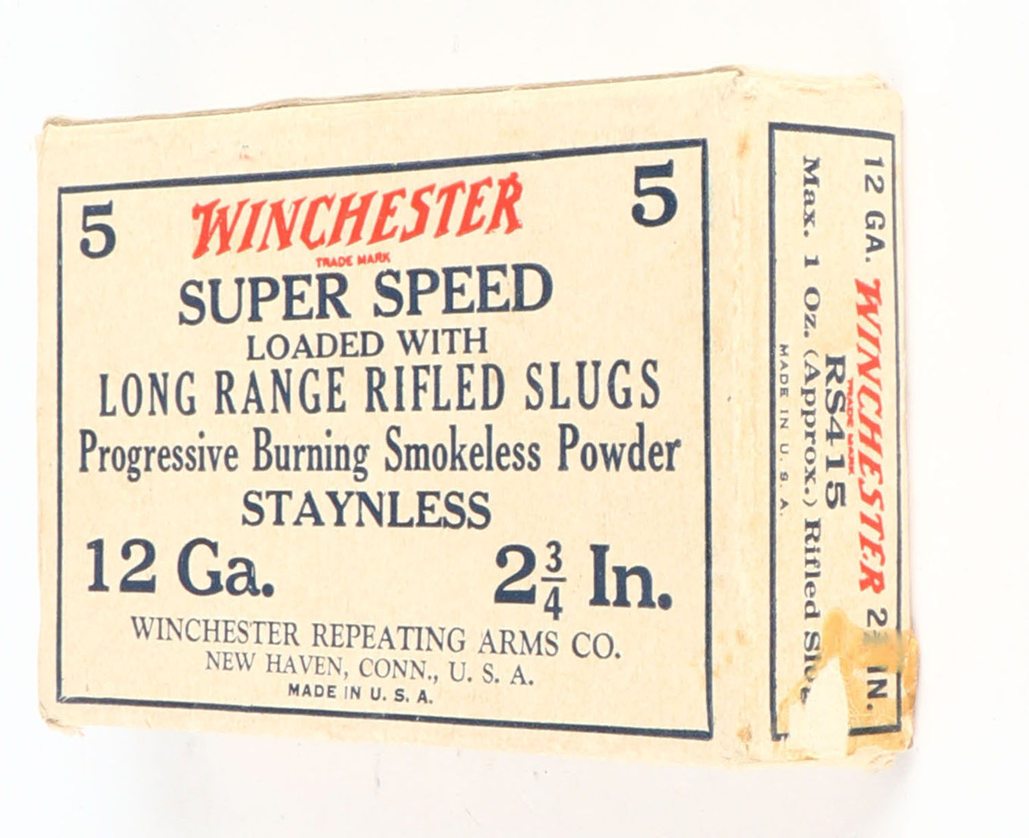 Winchester, Super Speed, STAYNLESS, 12ga., 2 3/4'', 1pc., Full, Rifled Slugs, Buff, blue & red box, box has scuffing with corner wear, paper shells are very good. Grade: Good ++ - Value: 8 to 30