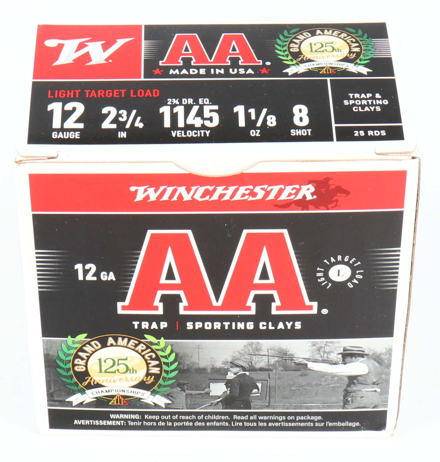 Winchester, Grand American 125th Anniversary, 12ga., 1pc., Full, shot size 8, box is very solid with excellent colors, plastic shells are excellent. Grade: MINT - Value: 20 to 80