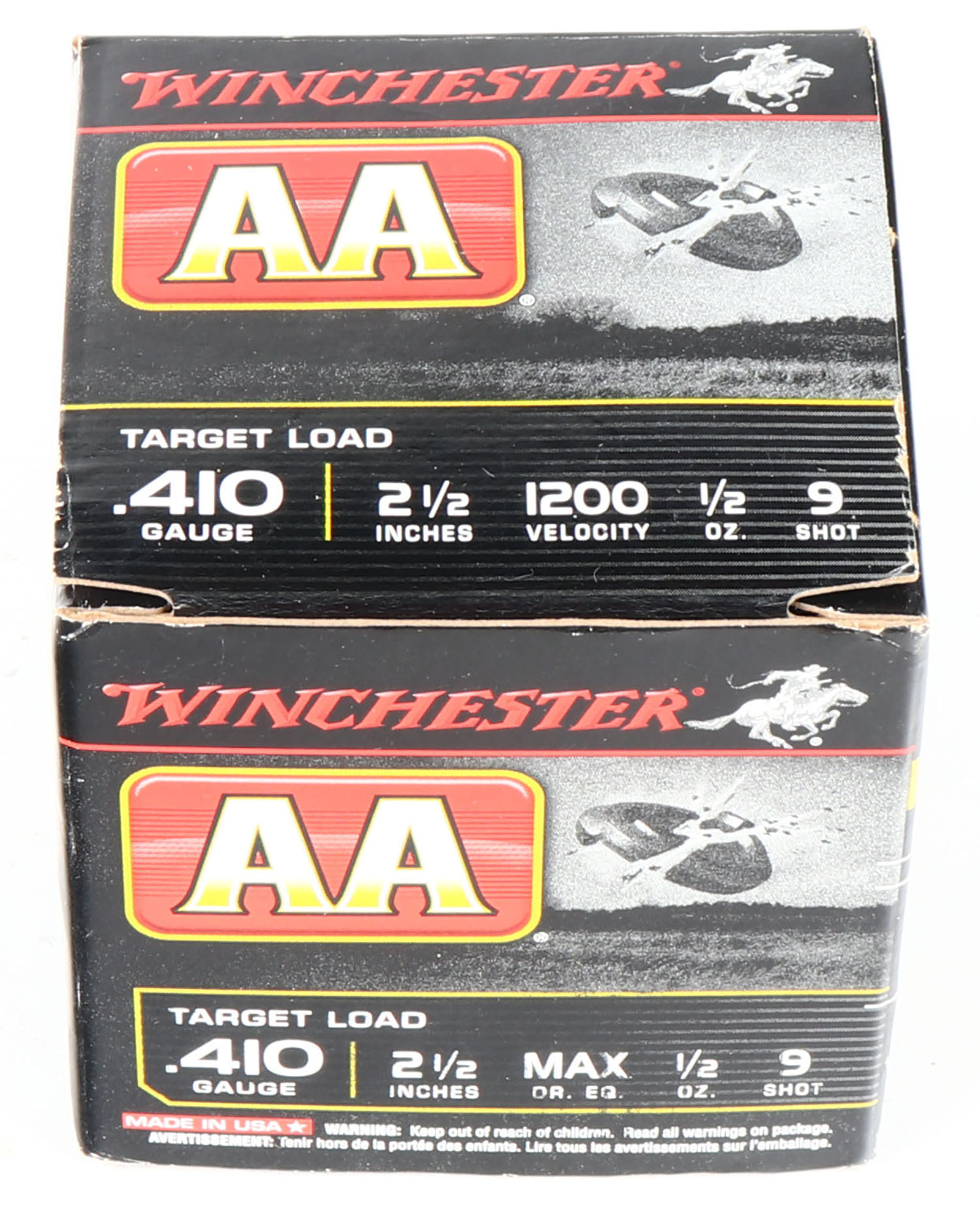 Winchester, AA, Target Load, 410ga., 2 1/2'', 1pc., Full, shot size 9, multi-colored box, box is very solid with great colors, plastic shells are excellent. Grade: MINT - Value: 10 to 30