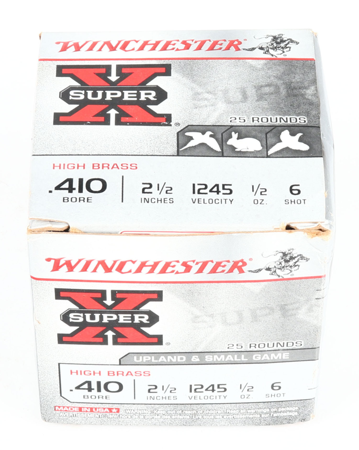 Winchester, Super-X High Brass, 410ga., 1pc., Full, shot size 6, box is very solid with great color, plastic shells are excellent. Grade: Excellent ++ - Value: 10 to 30