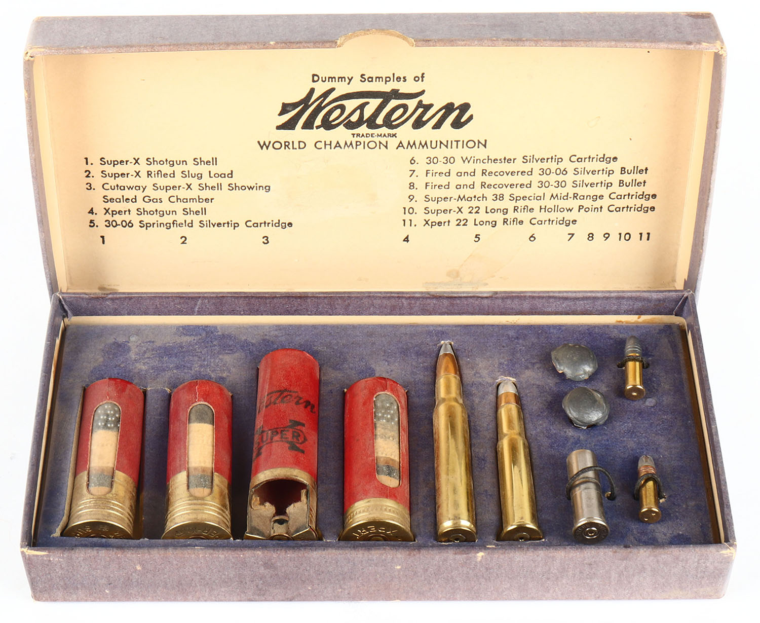 Early Western Salesman Sample Mixed Ammo, 3 Window shells & 1 cut away shells, shells inside are very good, 5 rifle/pistol rounds 2 bullets one being fired while other is cut away top of box has yellow label with Super-X and Xpert, box has light age soiling WITH FANTASTIC BLUE TOP LID. Grade: Excellent - Value: 100 to 400