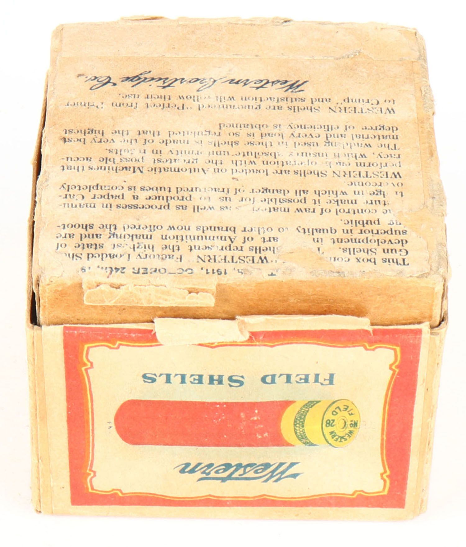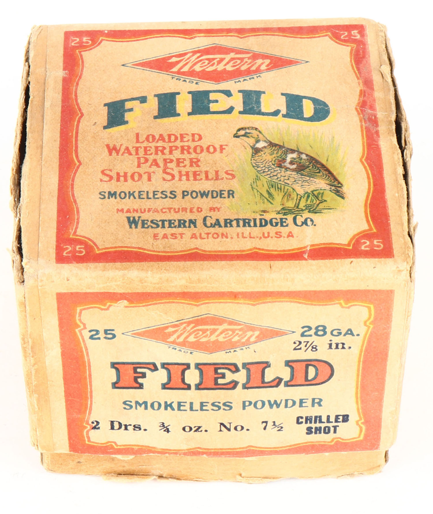 Western, Field, 28ga., 2pc, Partial 22rds,, shot size 7 1/2 CH, box has seam splits, box has scuffing & some age soiling, paper shells are very good. Grade: Very Good - Value: 100 to 400