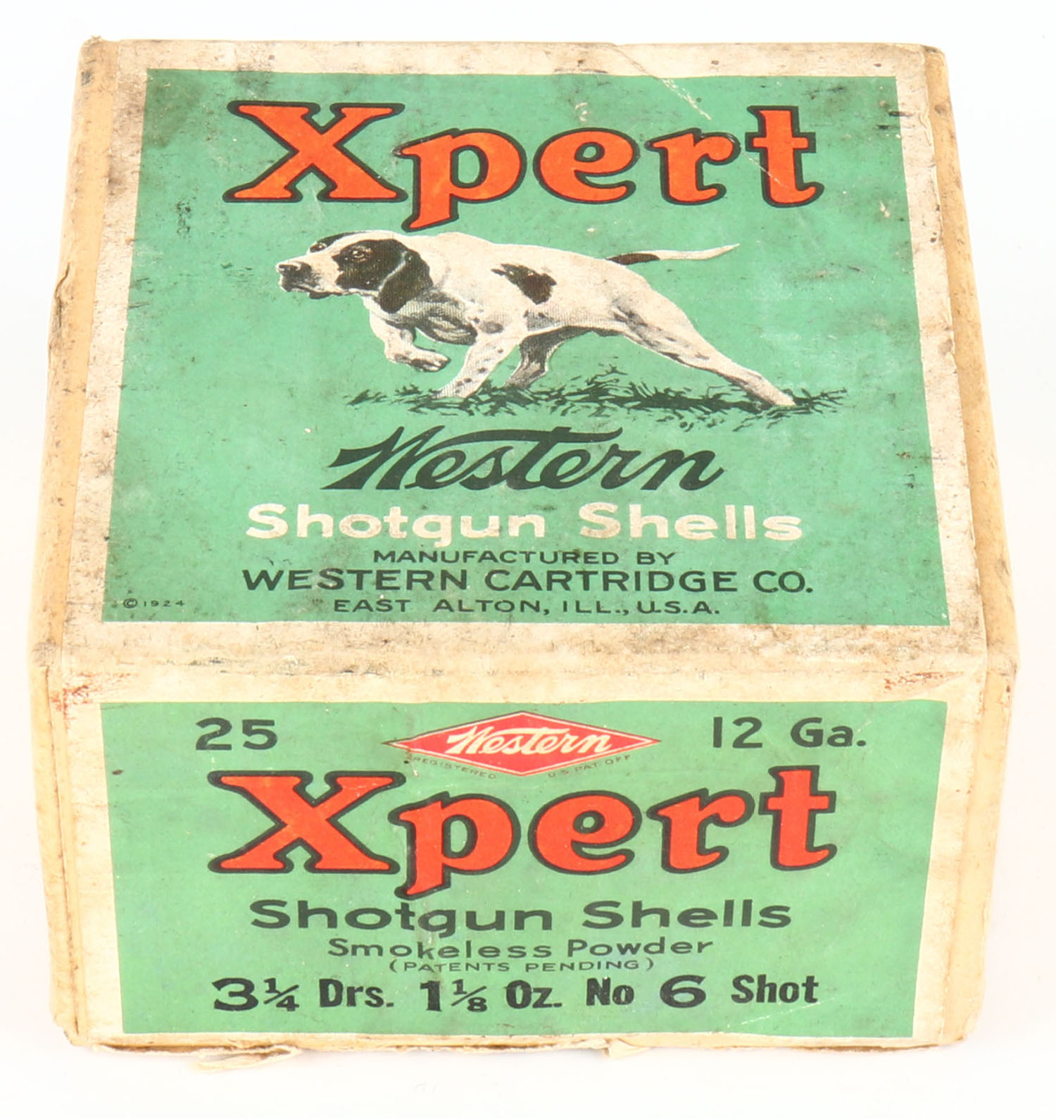 Western, Xpert, 12ga., 2pc., Empty, shot size 6, 3 1/4 Drs. 1 1/8 Oz., buff box with green, red & black label, box shows dog on point, box has scuffing with light age soiling, Western Diamond Logo on one side. Grade: Very Good ++ - Value: 300 to 600