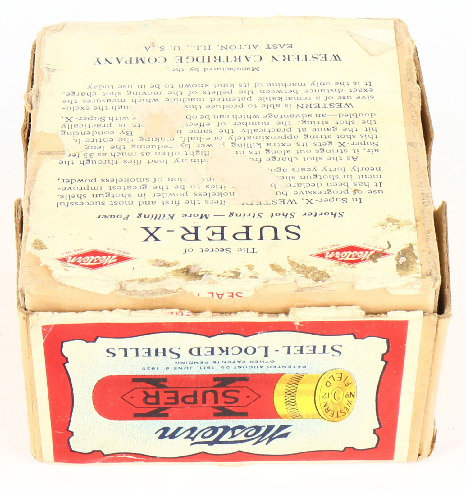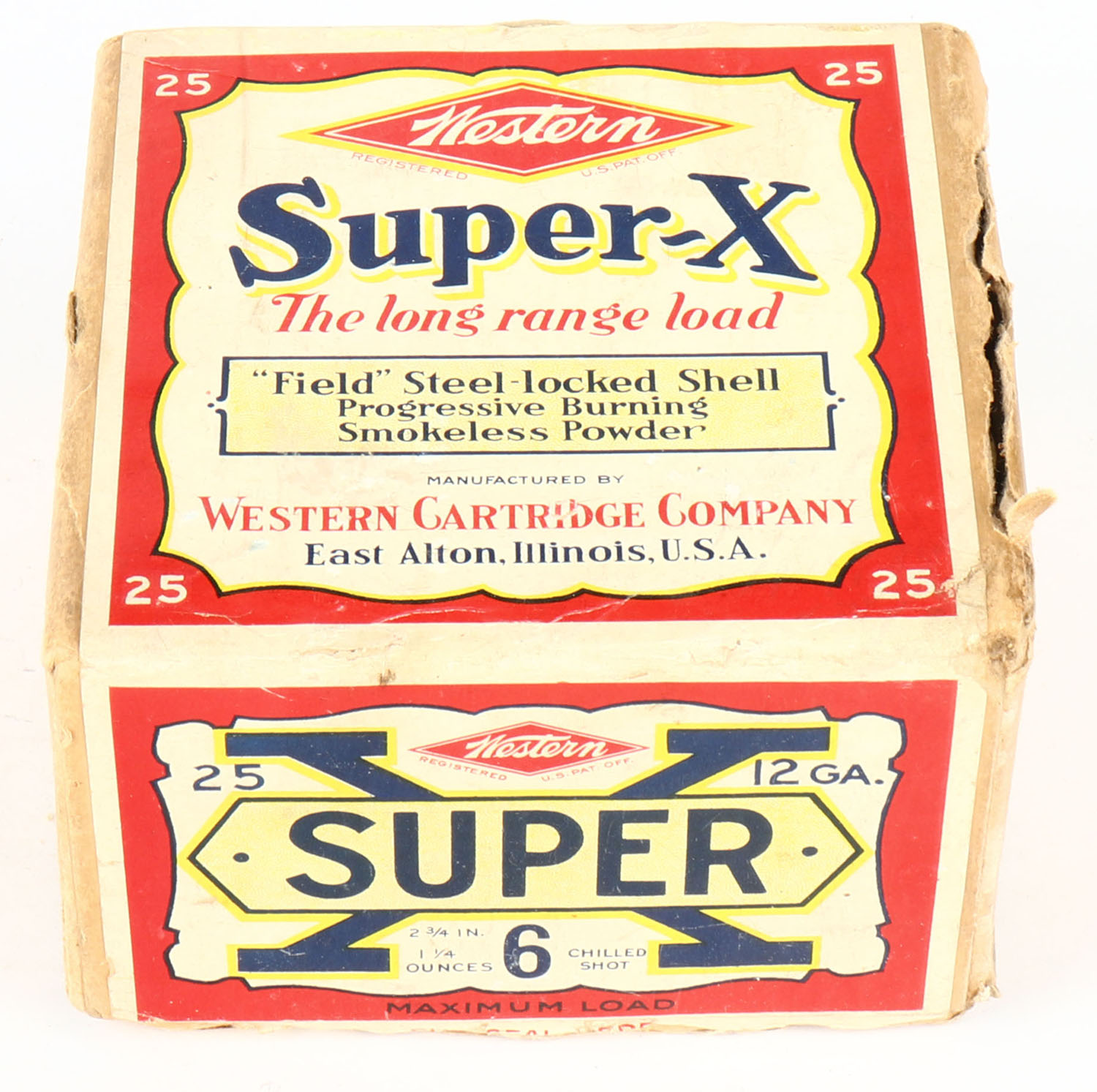 Western, Super-X, 12ga., 2pc., Full with 15 rds being correct shot size, shot size 6 Chilled Shot, 2 3/4'', buff box with multi colored label, box has seam split with scuffing, paper shells are very good. Grade: Very Good - Value: 10 to 60