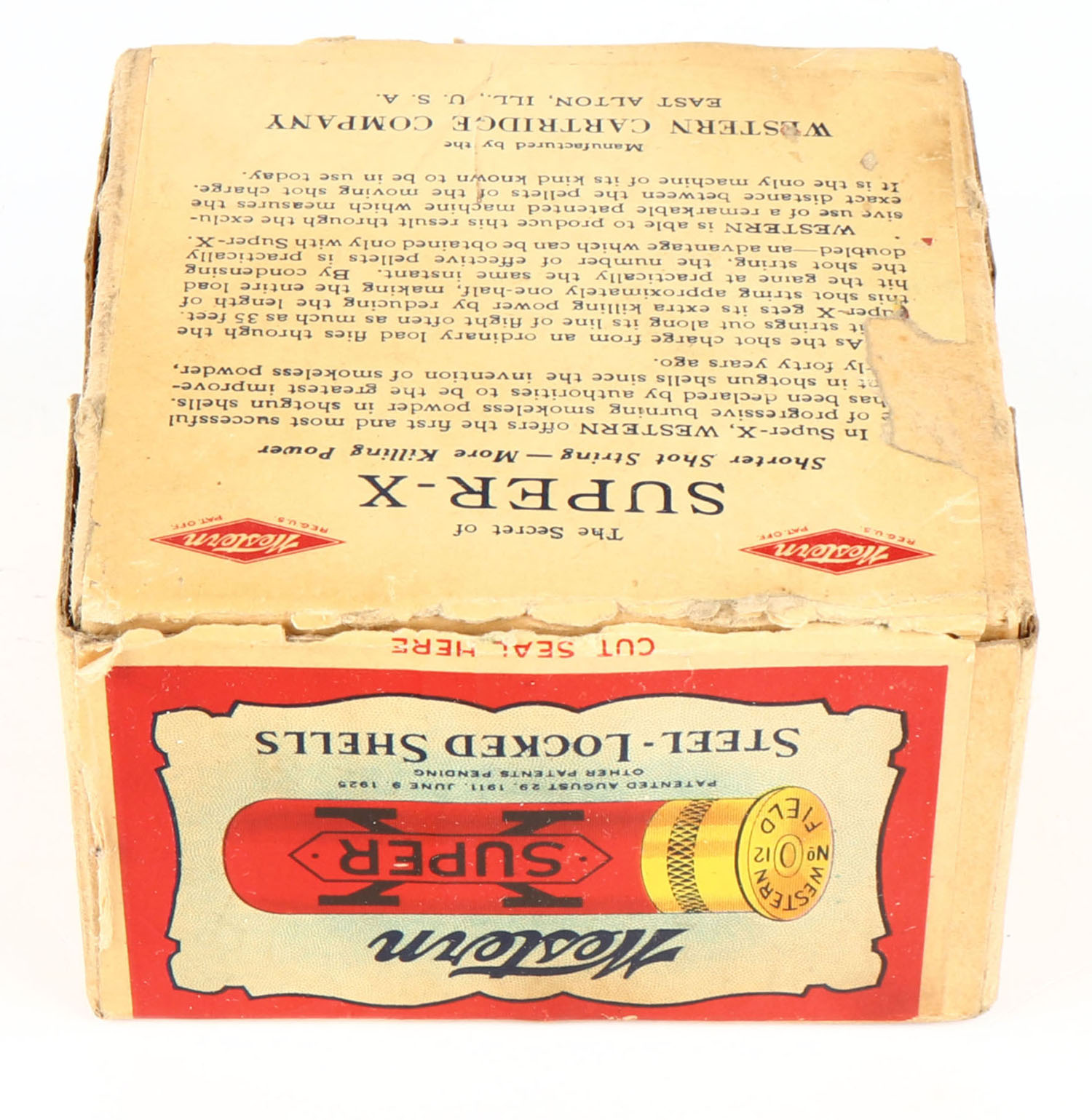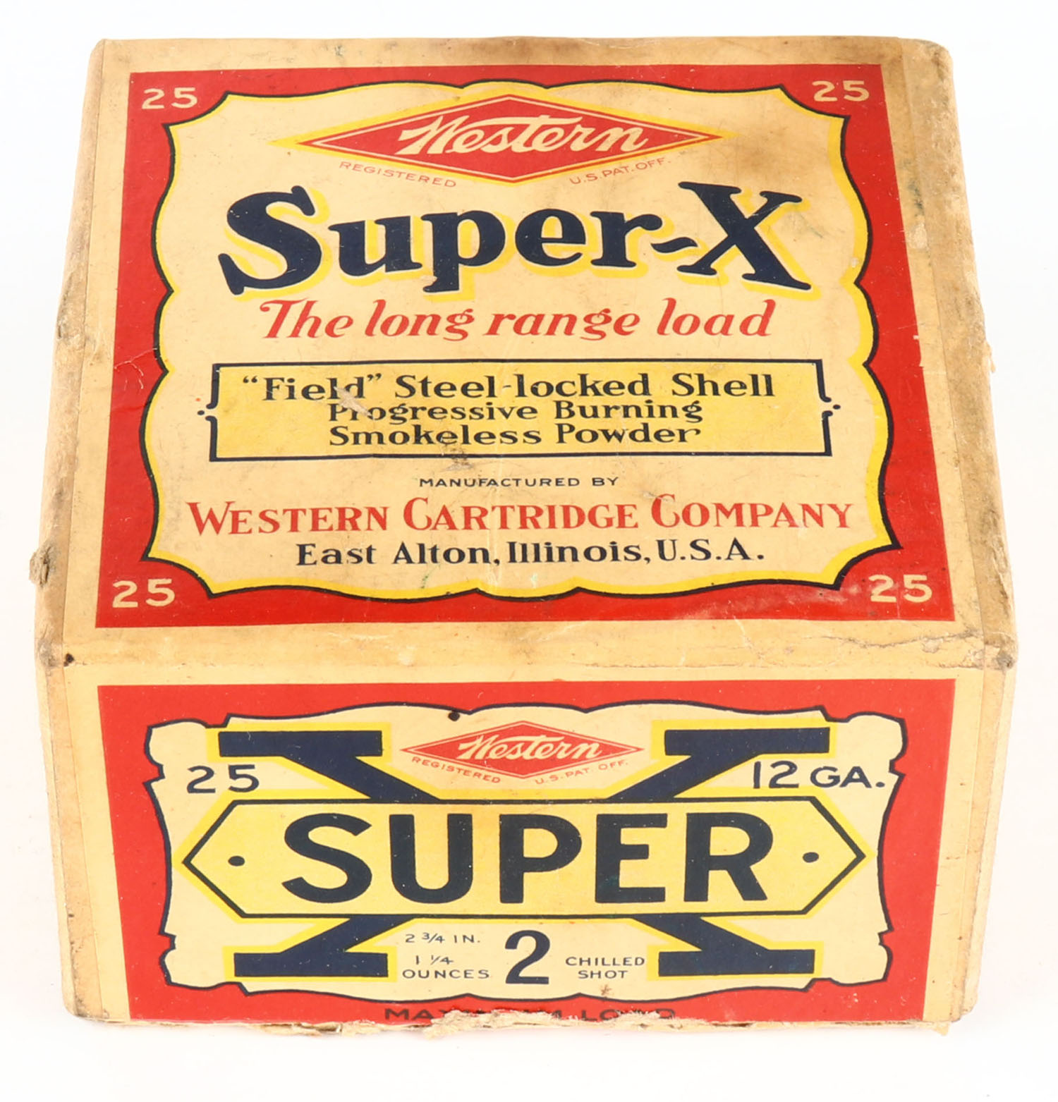 Western, Super X, 12ga., 2pc., Partial 20rds., shot size 2Ch., buff box with multi-colored label, box has age soiling with some scuffing, paper shells are very good. Grade: Very Good - Value: 40 to 200