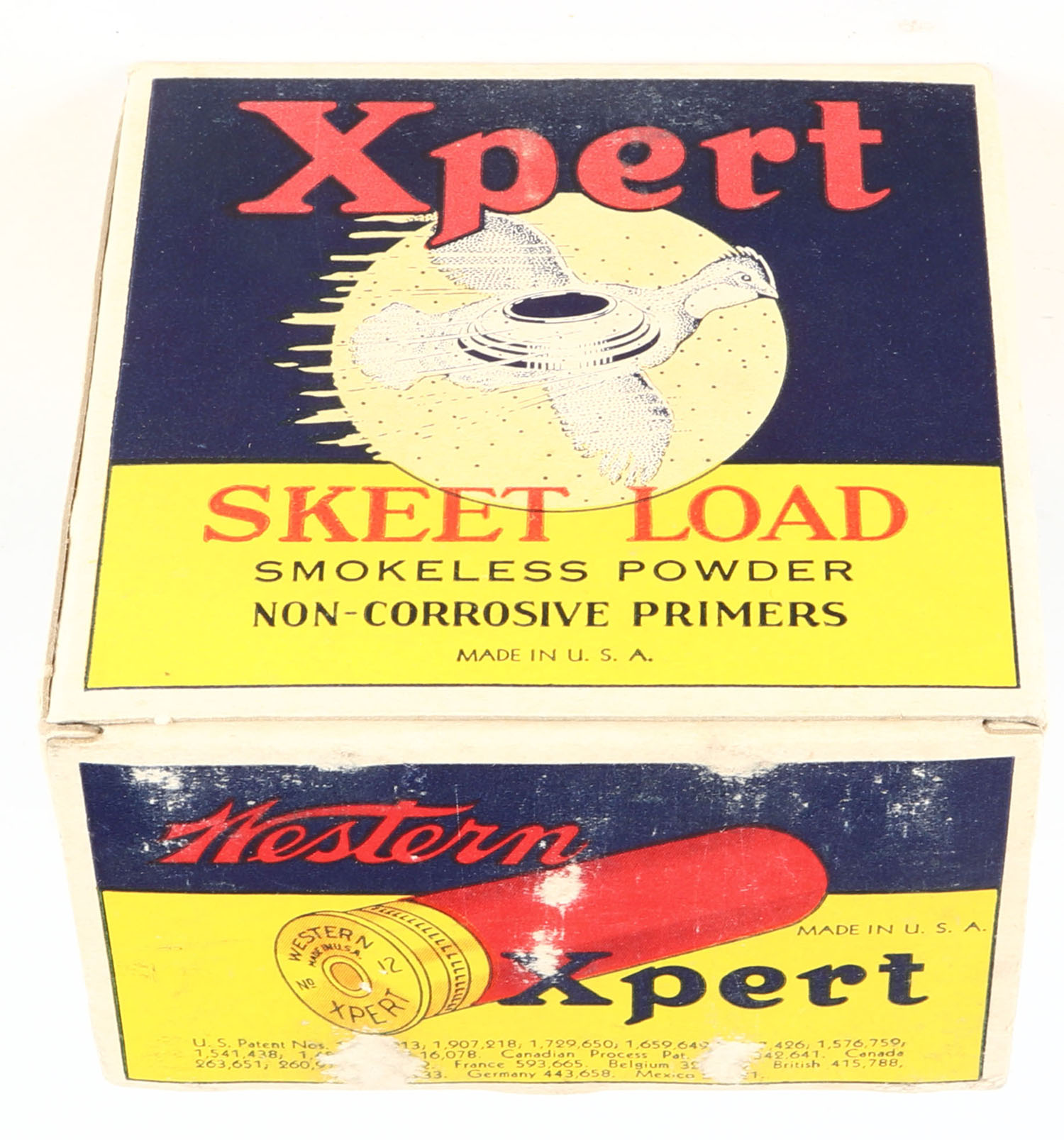 Western Xpert, SKEET LOAD, 12ga., 1pc., Full with Insert, buff box with blue & red on box that pictures flying Quail with skeet in body & shot all around, Loading: 3 Drams 1 1/8 Oz. No. 9 Chilled Shot, box is very solid with great colors, paper shells are excellent. Grade: Excellent ++ - Value: 200 to 800