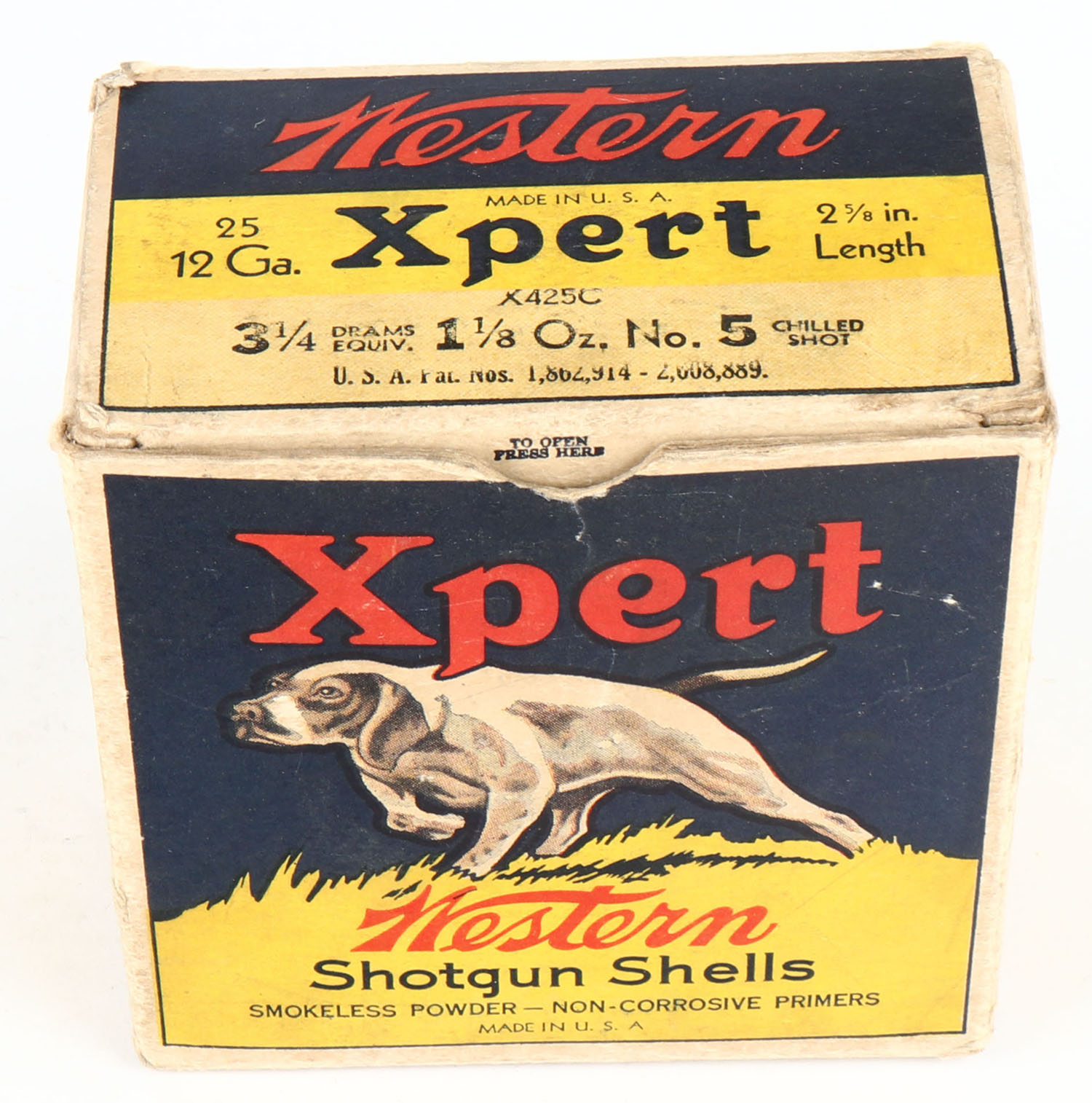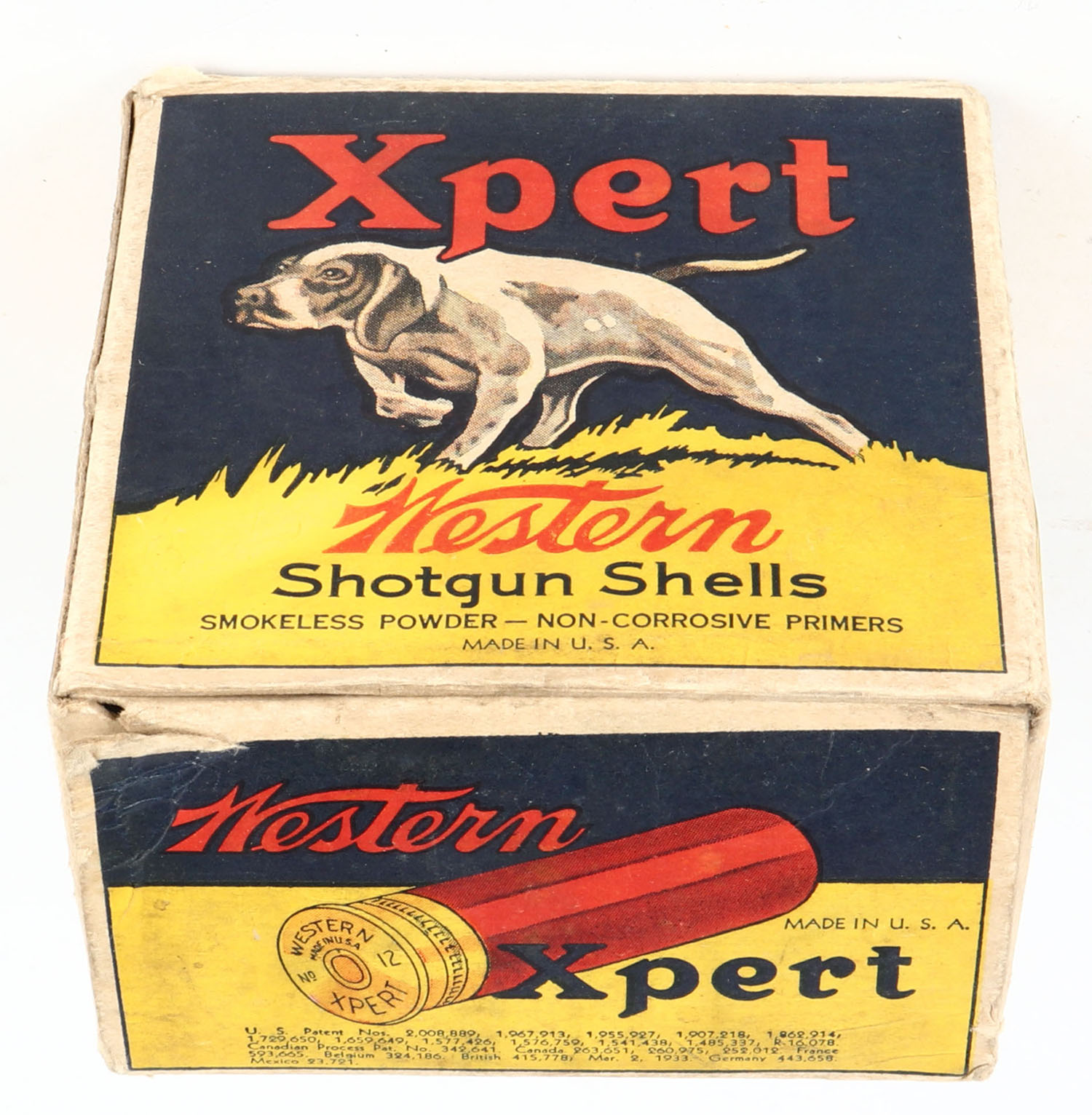 Western, Xpert, 12ga., 2 5/8'', 1pc., Empty, Shot size 5CH, blue, yellow & red box with a dog on point, box has some shelf wear with great color. Grade: Excellent - Value: 20 to 60