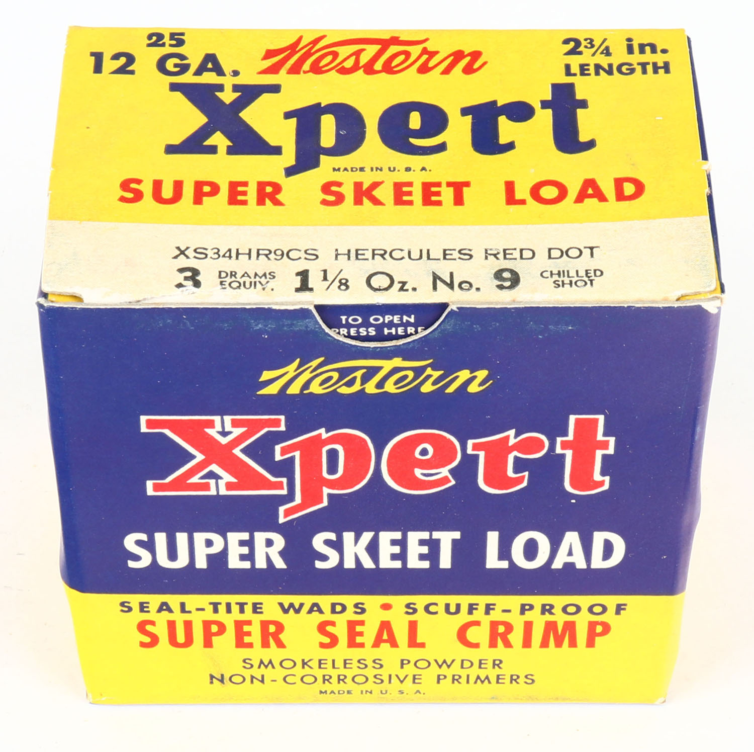 Western, Xpert, Super Skeet Load, Hercules Red Dot, 12ga., 1pc., Full, Shot size 9 Chilled, 2 3/4'', multi-colored box, box is very solid with excellent colors, paper shells are minty. Grade: MINT - Value: 20 to 60