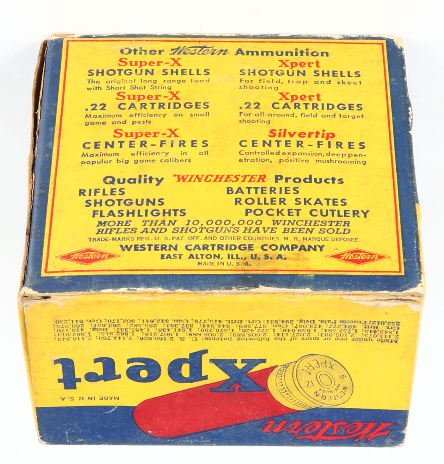 Western Xpert, 12ga., 1pc., Partial 24rds, shot size 9, 2 5/8'', multi-colored box, box has light scuffing with very nice colors, paper shells are very good. Grade: Very Good ++ - Value: 10 to 30