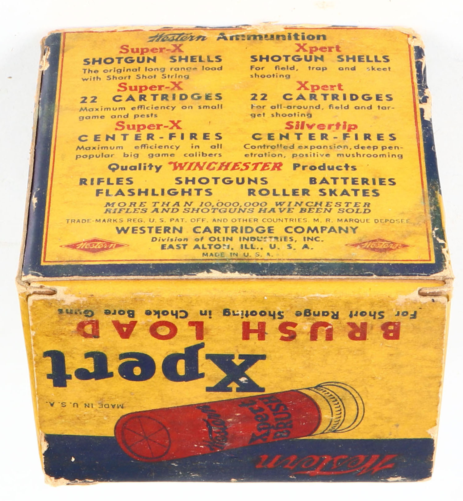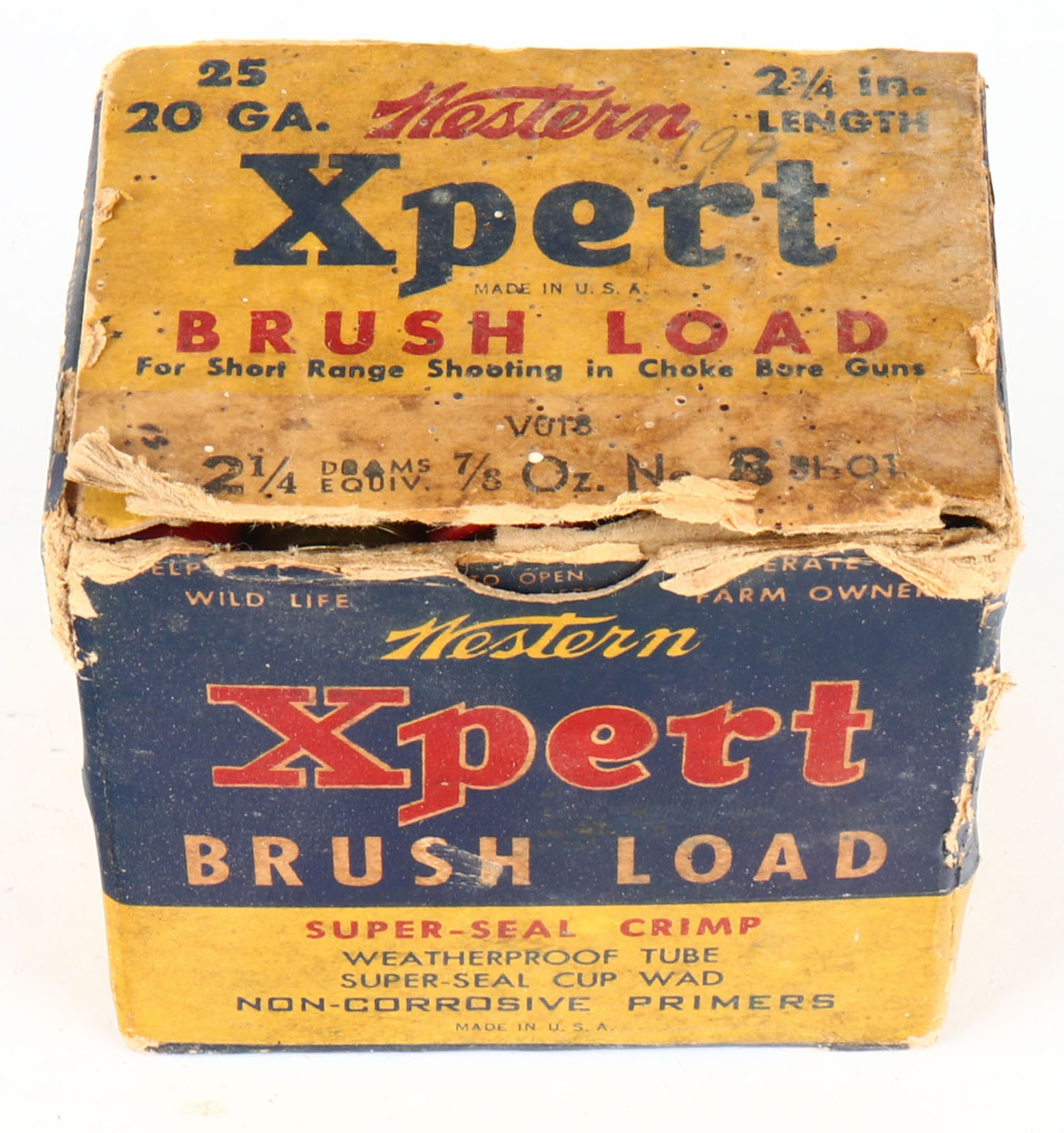 Western, Xpert, Brush Load, 20ga., 1pc., Full, shot size 8, 2 3/4'', multi-colored box, box has age soiling with edge wear & seam splits, paper shells are excellent. Grade: Good - Value: 10 to 30