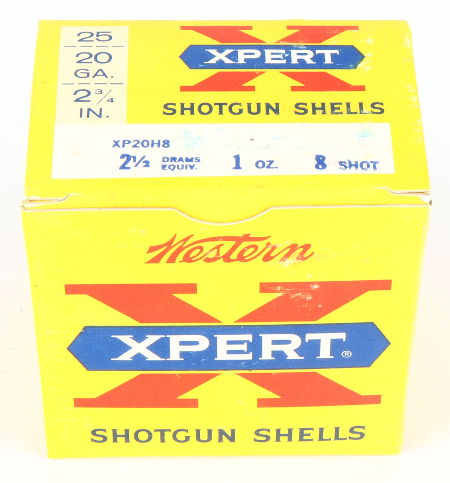 Western, Xpert, 20ga., 2 3/4'', 1pc., Full, shot size 8, multi-colored box, box is very solid with great colors, paper shells are minty. Grade: MINT - Value: 20 to 60