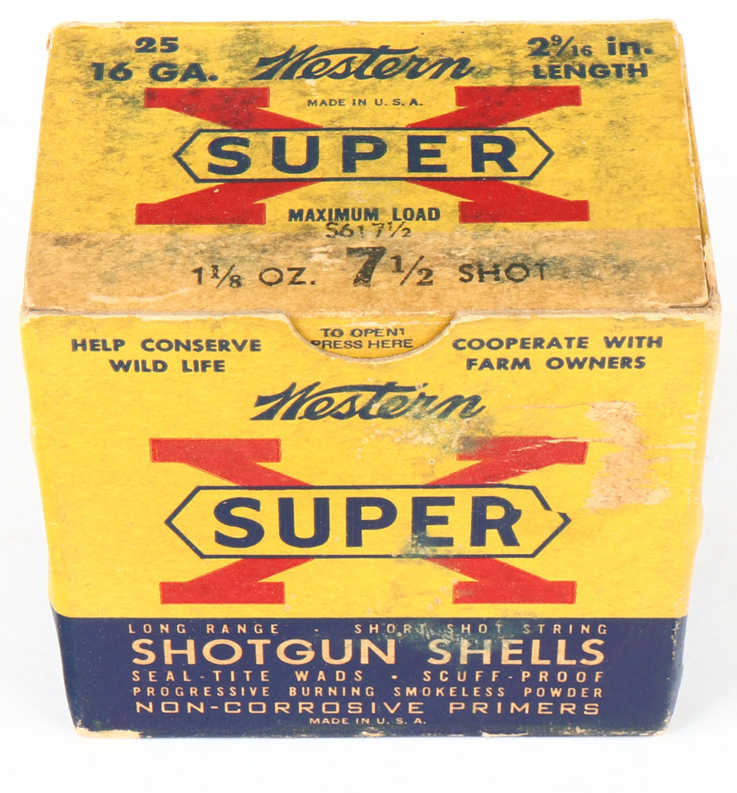 Western Xpert, 16ga., 1pc., Full, shot size 7 1/2, 2 9/16'', mulit-colored box, box has age soiling & scuffing, paper shells are excellent, Grade: Very Good - Value: 10 to 30