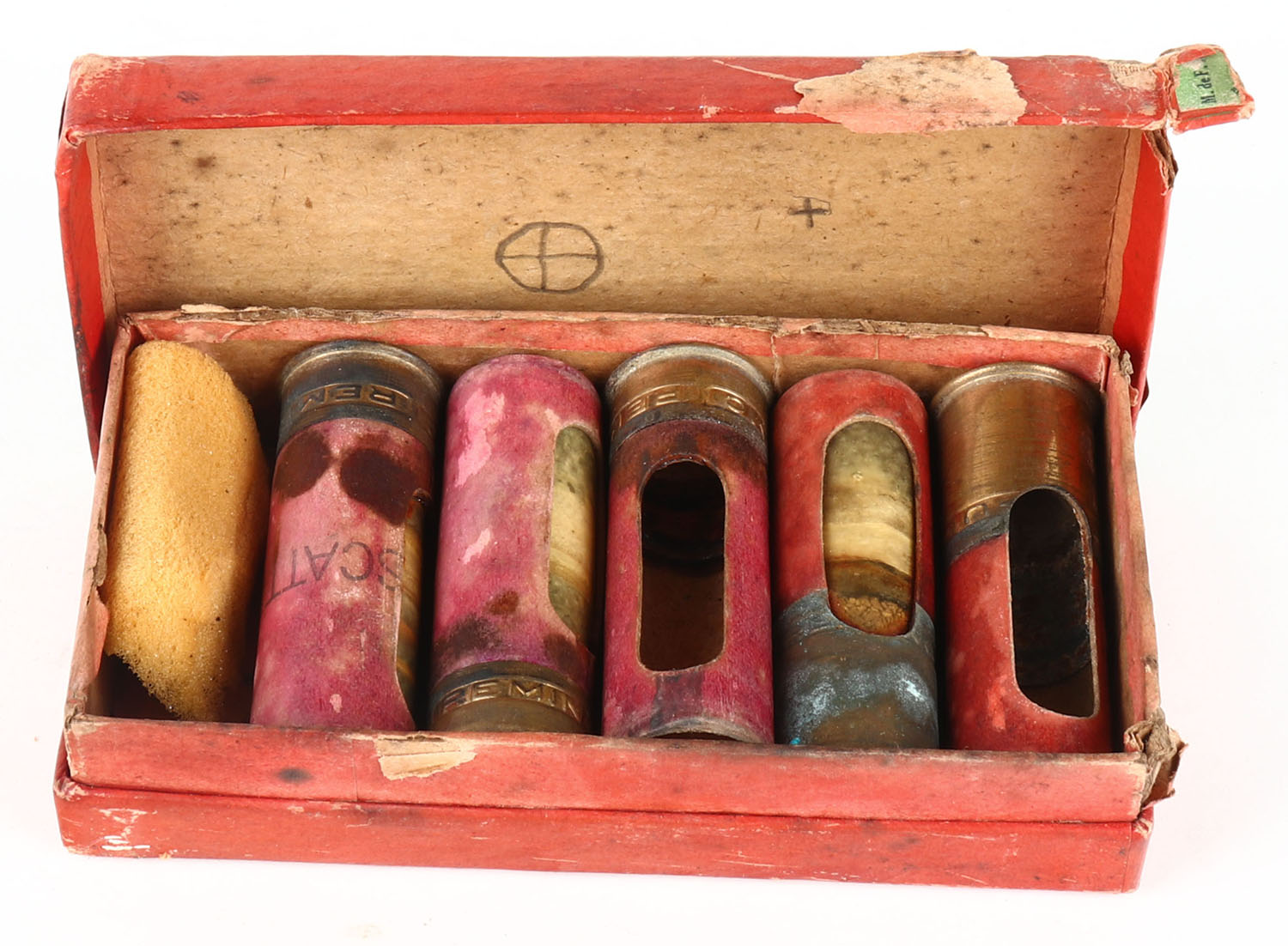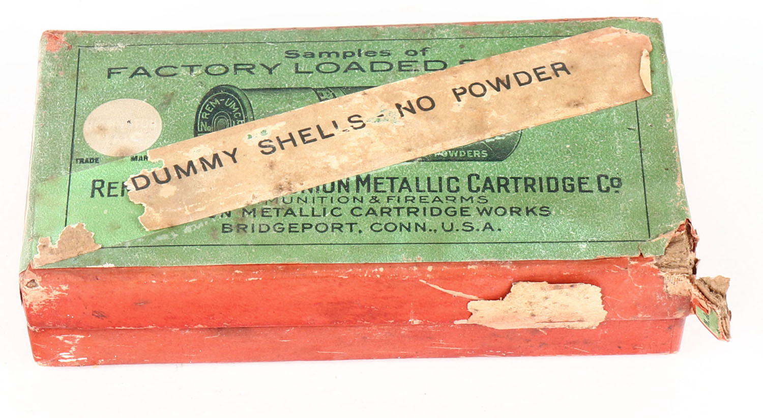RARE! Remington UMC Salesman Sample Set, has 5 12ga. WINDOW Dummy shells, 3 being Nitro Club, 2 being Arrow, 2pc., Partial, Red box with green & black label, box has age soiling with scuffing & edge wear, paper shells are fair. Grade: Good - Value: 100 to 500