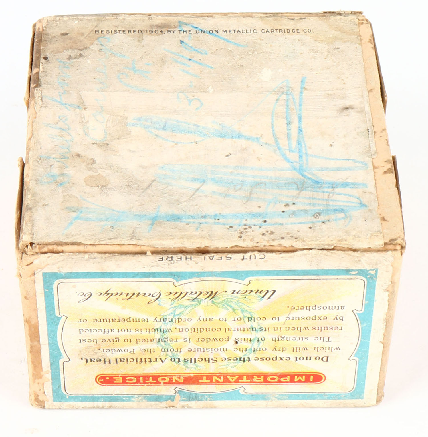 U.M.C. Nitro Club, 12ga., 2pc., Empty, shot size 7 1/2 CH., 3 1/8 Drs., 1 1/4 Oz., buff box with sunburst logo & Mallard flying on top, box has some age soiling & scuffing with writing on bottom. Grade: Very Good + - Value: 50 to 250