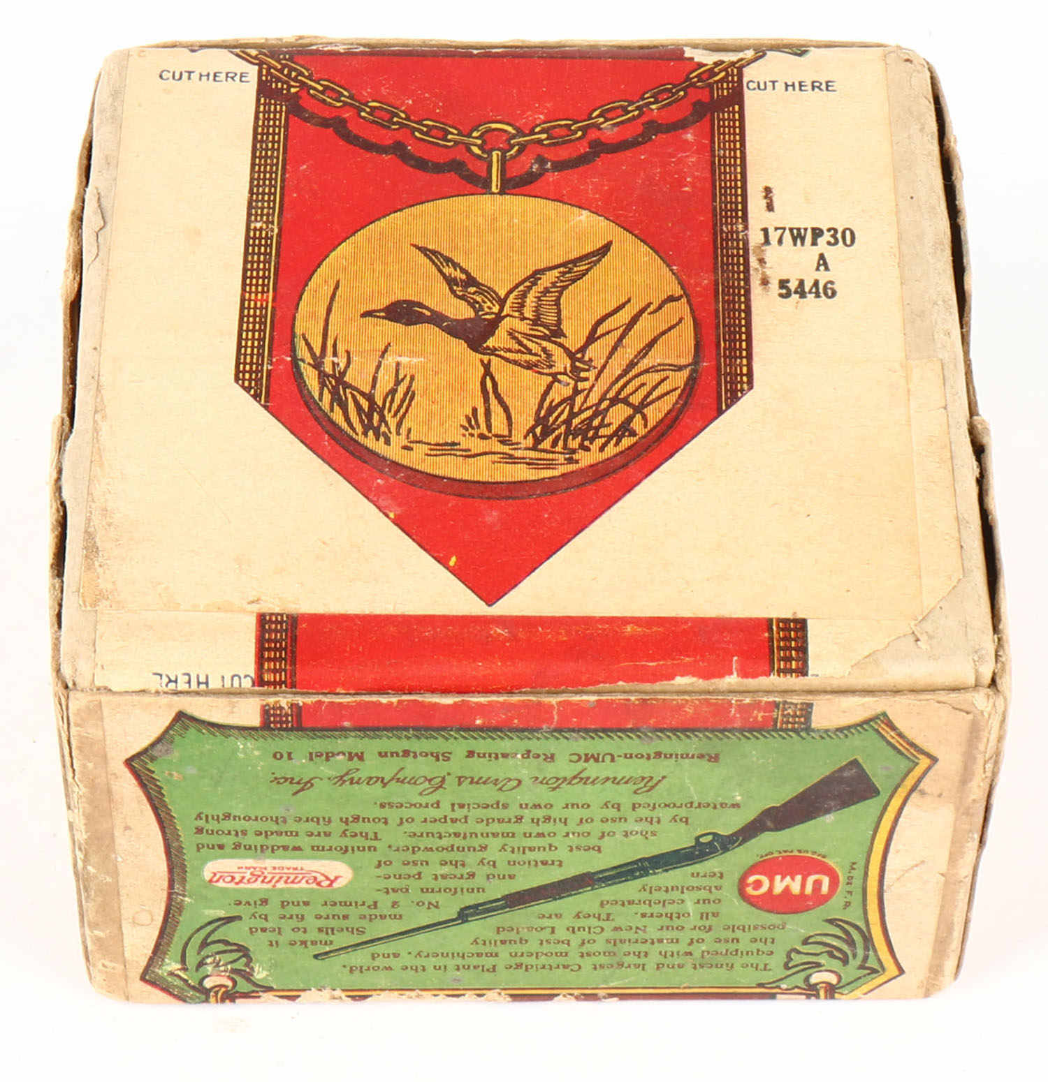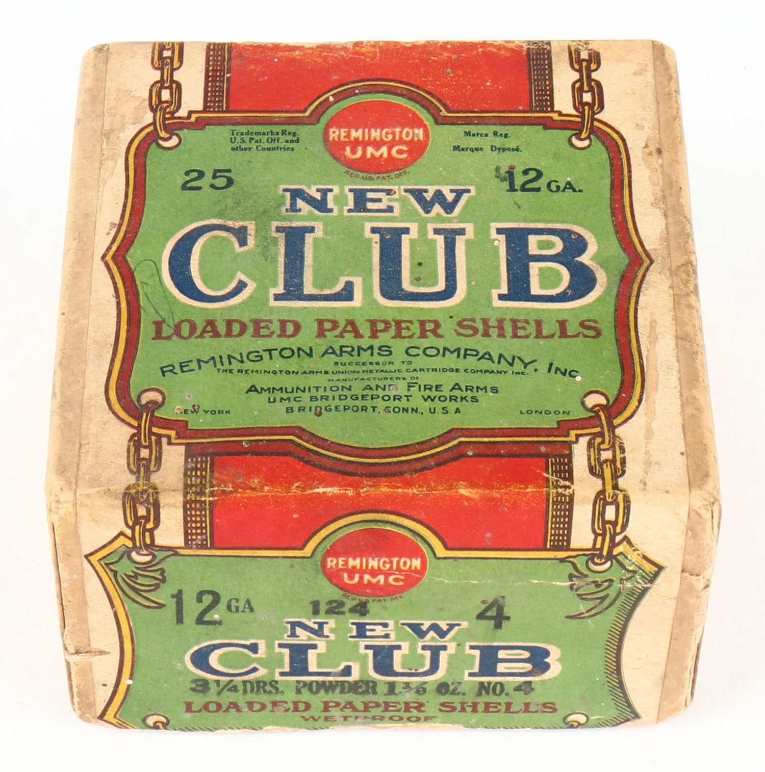 Remington UMC, New Club, 12ga, 2pc., Empty, Loading: 3 1/4 Drs. 1 1/8 Oz. No. 4, buff box with green, yellow, blue & red paper label, box has light scuffing with edge wear & a seam split. Grade: Very Good ++ - Value: 100 to 400