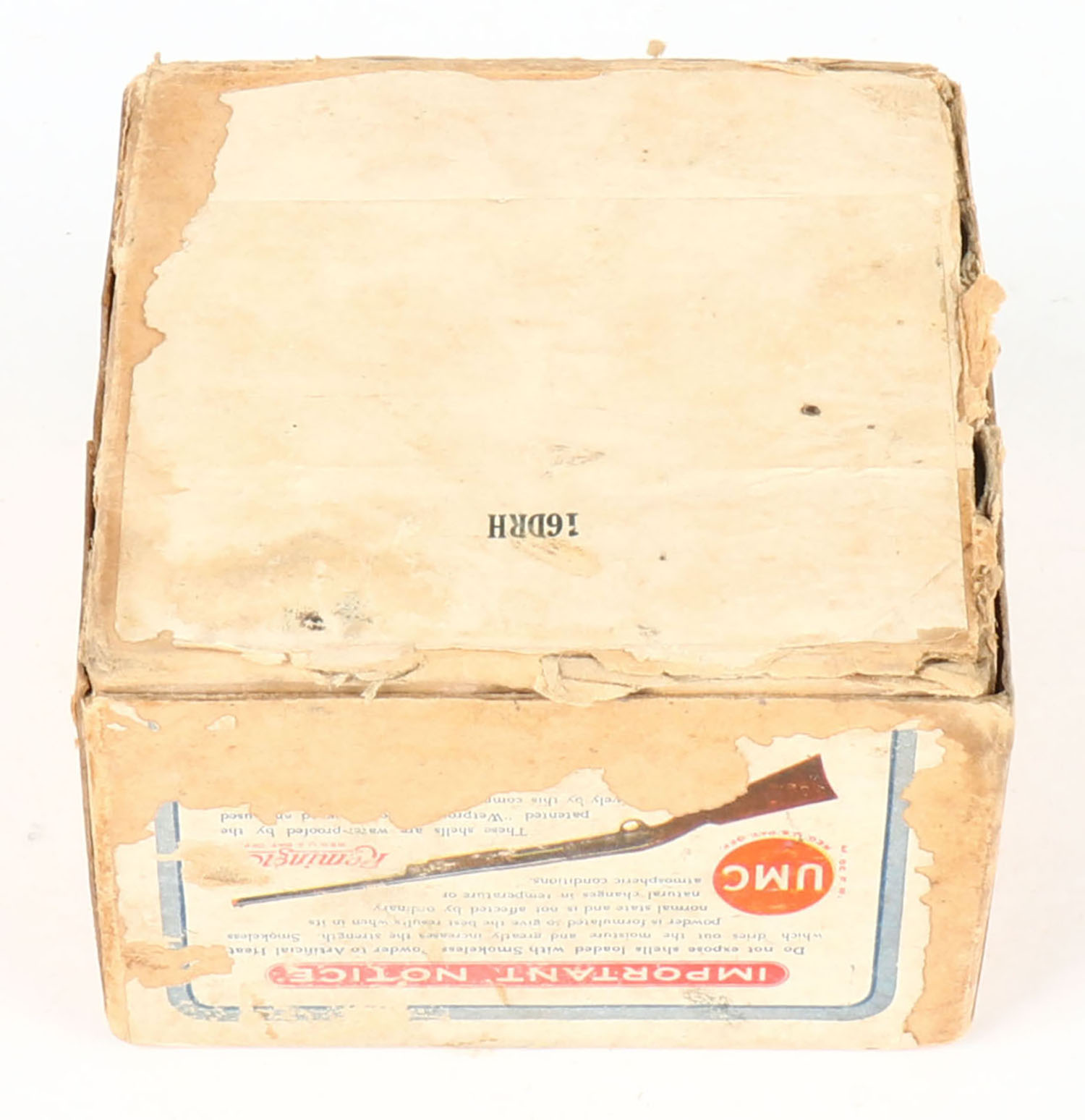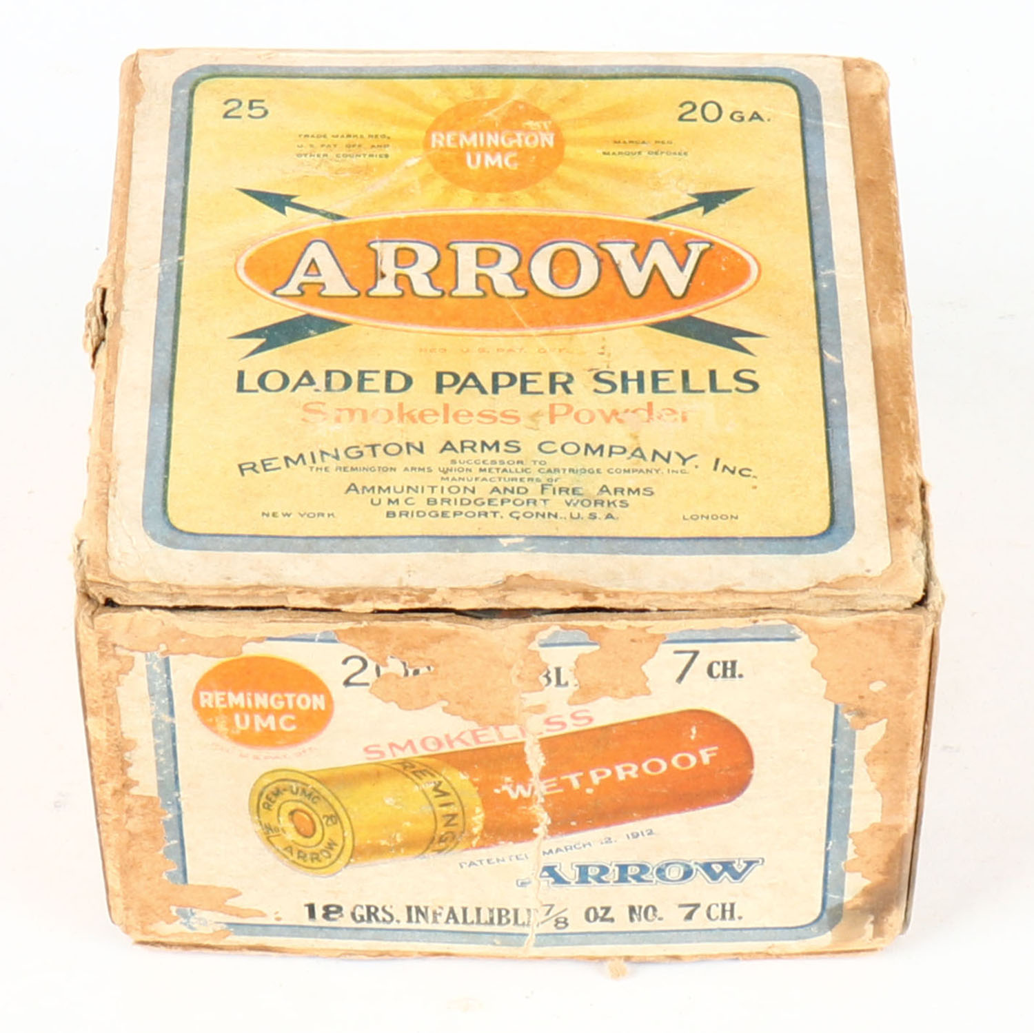REM UMC, ARROW, 20ga., 2pc., Full, shot size 7CH, buff box with sunburst logo, box has soiling & scuffing, has seam splits with the label being 80% intact, paper shells are poor. Grade: Good - Value: 30 to 100