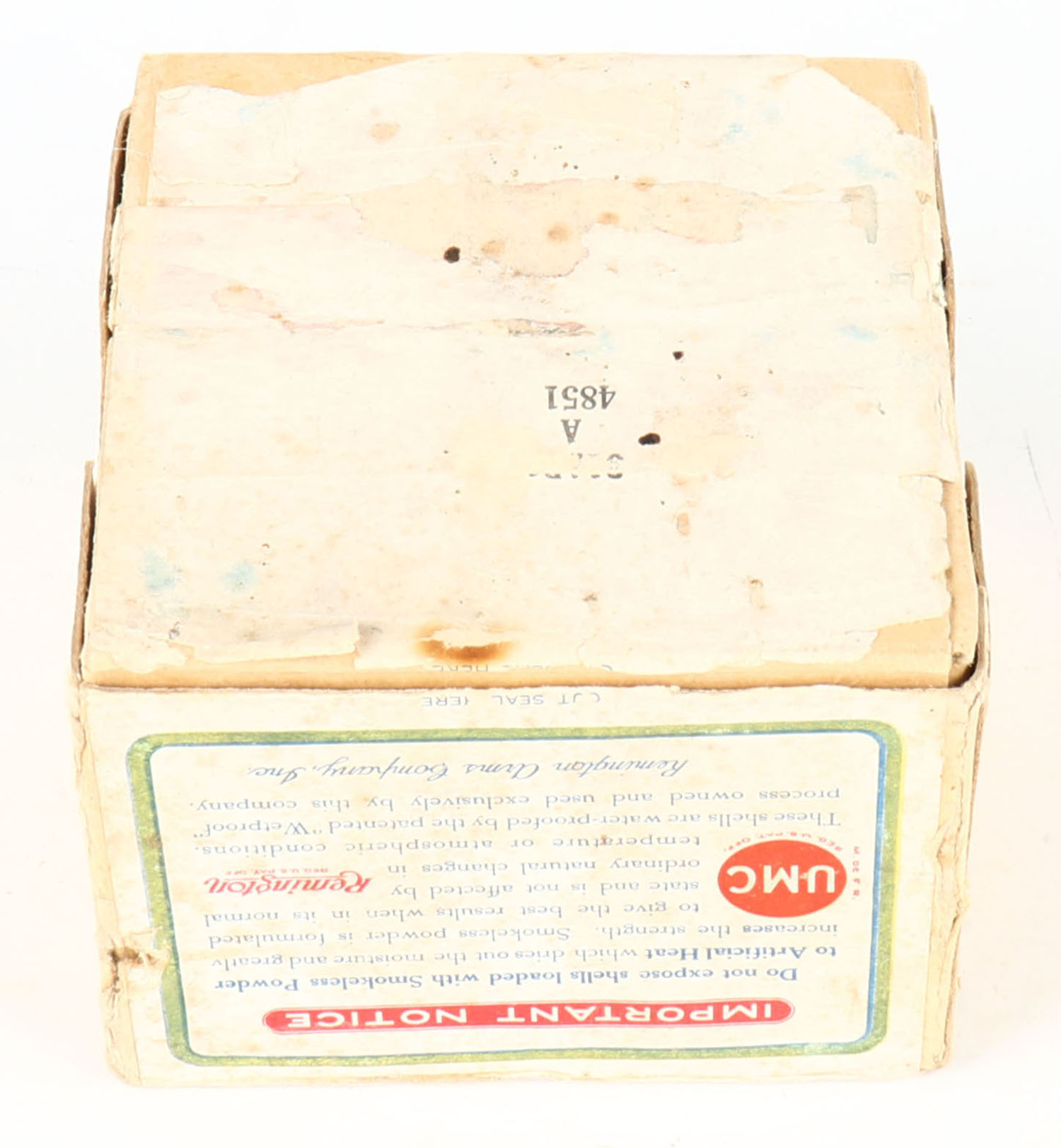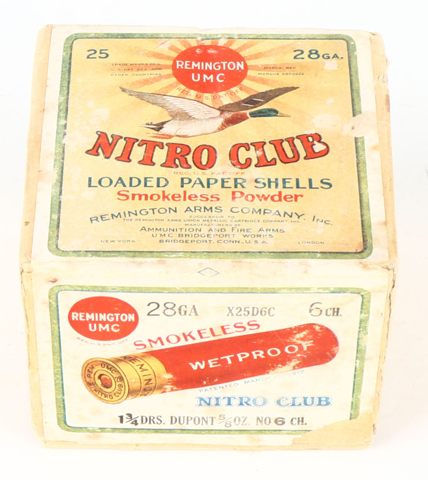 Remington UMC, Nitro Club, 28ga., 2pc., Partial 14rds. 7 being correct shot size, Loading: 1 3/4 Drs. DuPont, 5/8 Oz., 6 CH. Shot, buff box with sunburst logo & Mallard flying on top, box has light age soiling with edge wear, paper shells are very good. Grade: Very Good ++ - Value: 60 to 300
