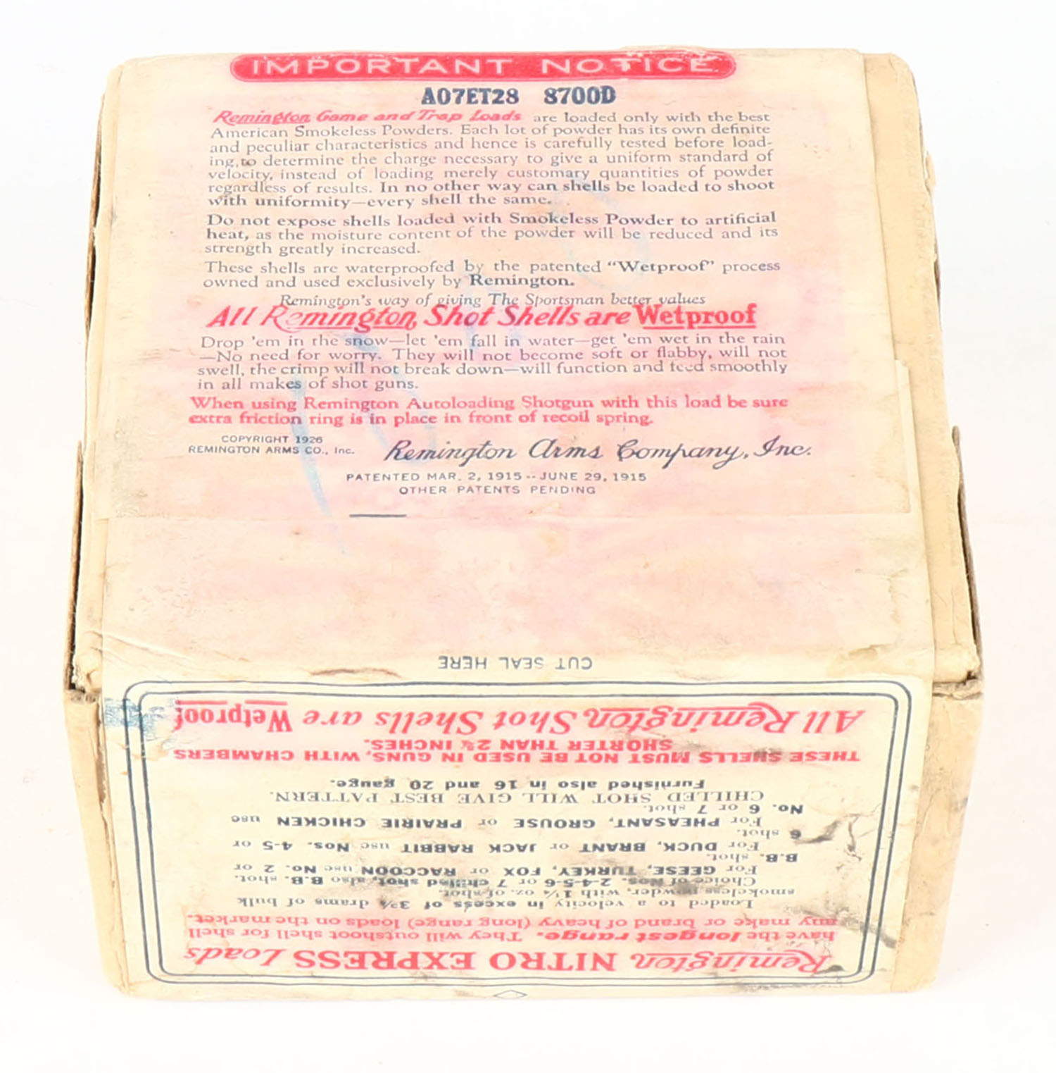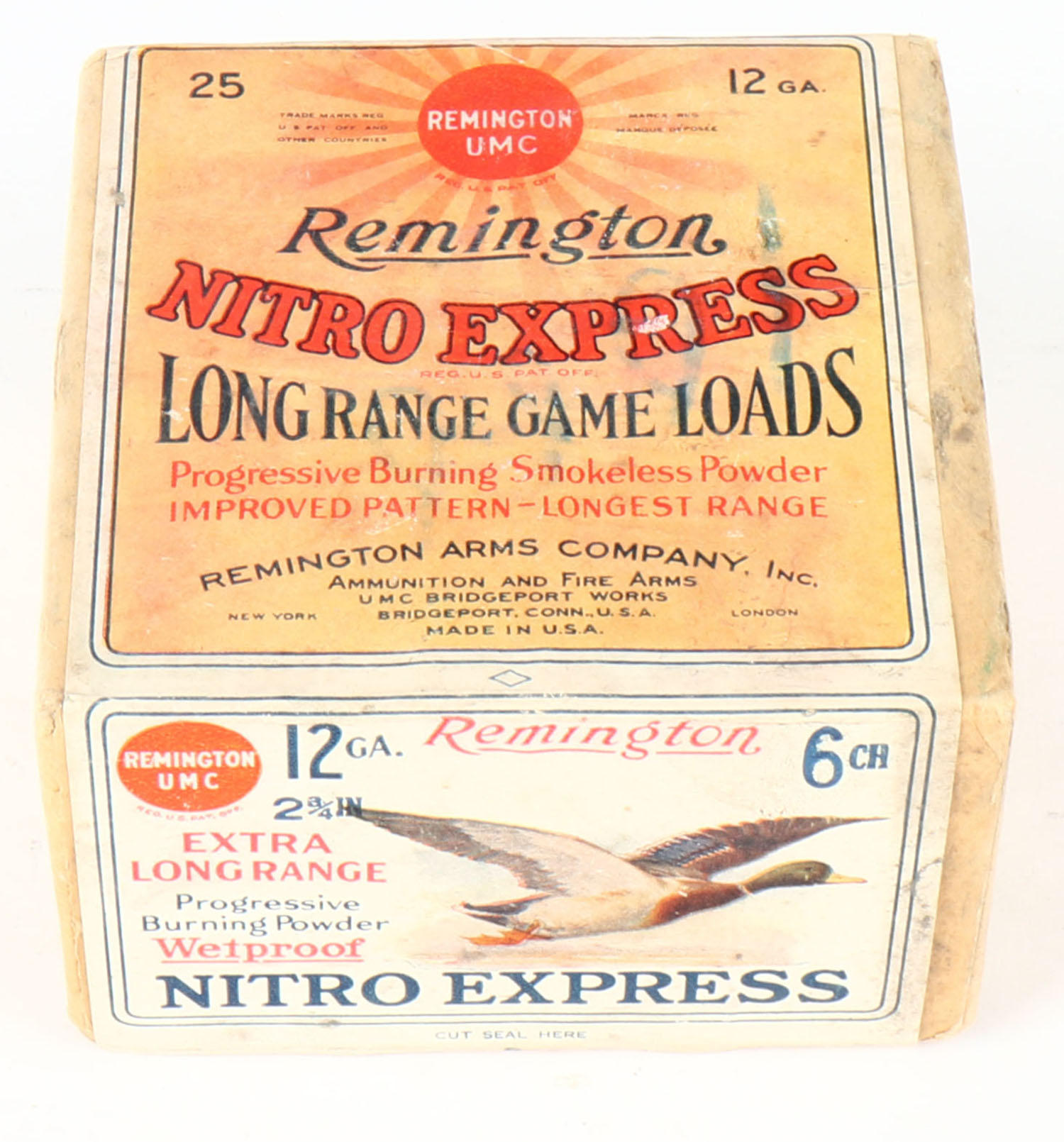 Remington Nitro Express Long Range GAME LOADS, Flying Mallard, 12ga., 2pc., FULL & SEALED, shot size 6 CH, buff box with sunburst logo, box has scuffing with great color. Grade: Excellent - Value: 100 to 400