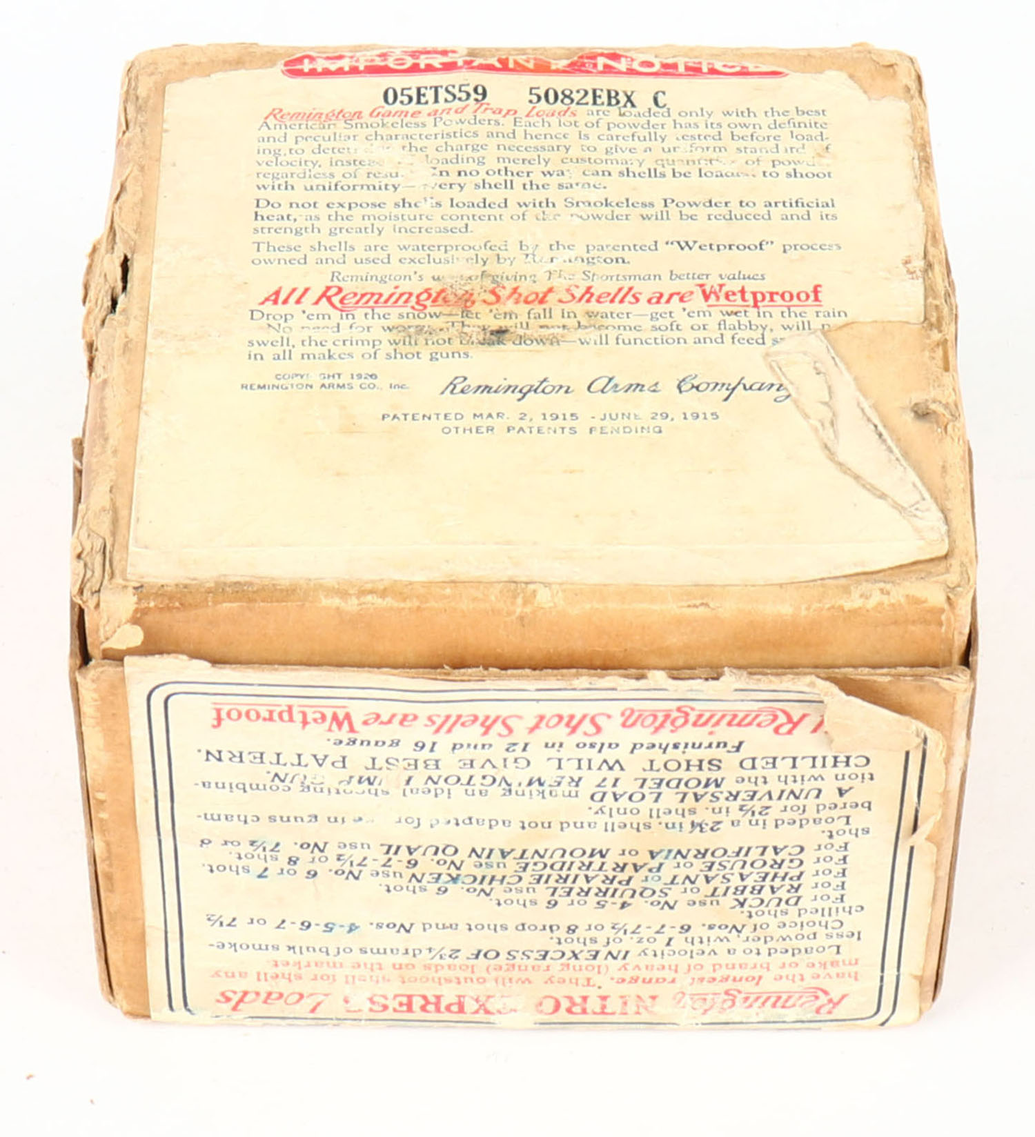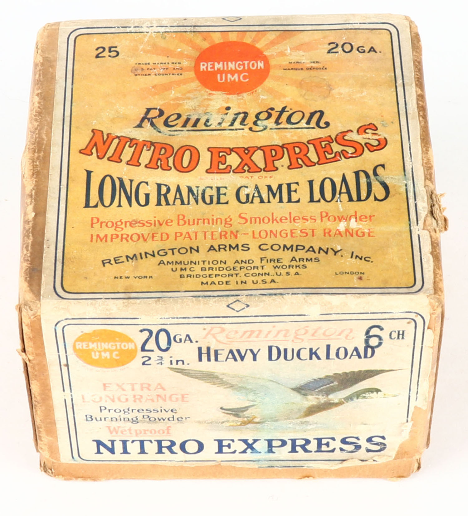 Remington Nitro Express Long Range GAME LOADS, Flying Mallard, 20ga., 2pc., Full, shot size 6 CH, buff box with sunburst logo, box has age soiling with edge wear, paper shells are very good. Grade: Very Good + - Value: 40 to 200