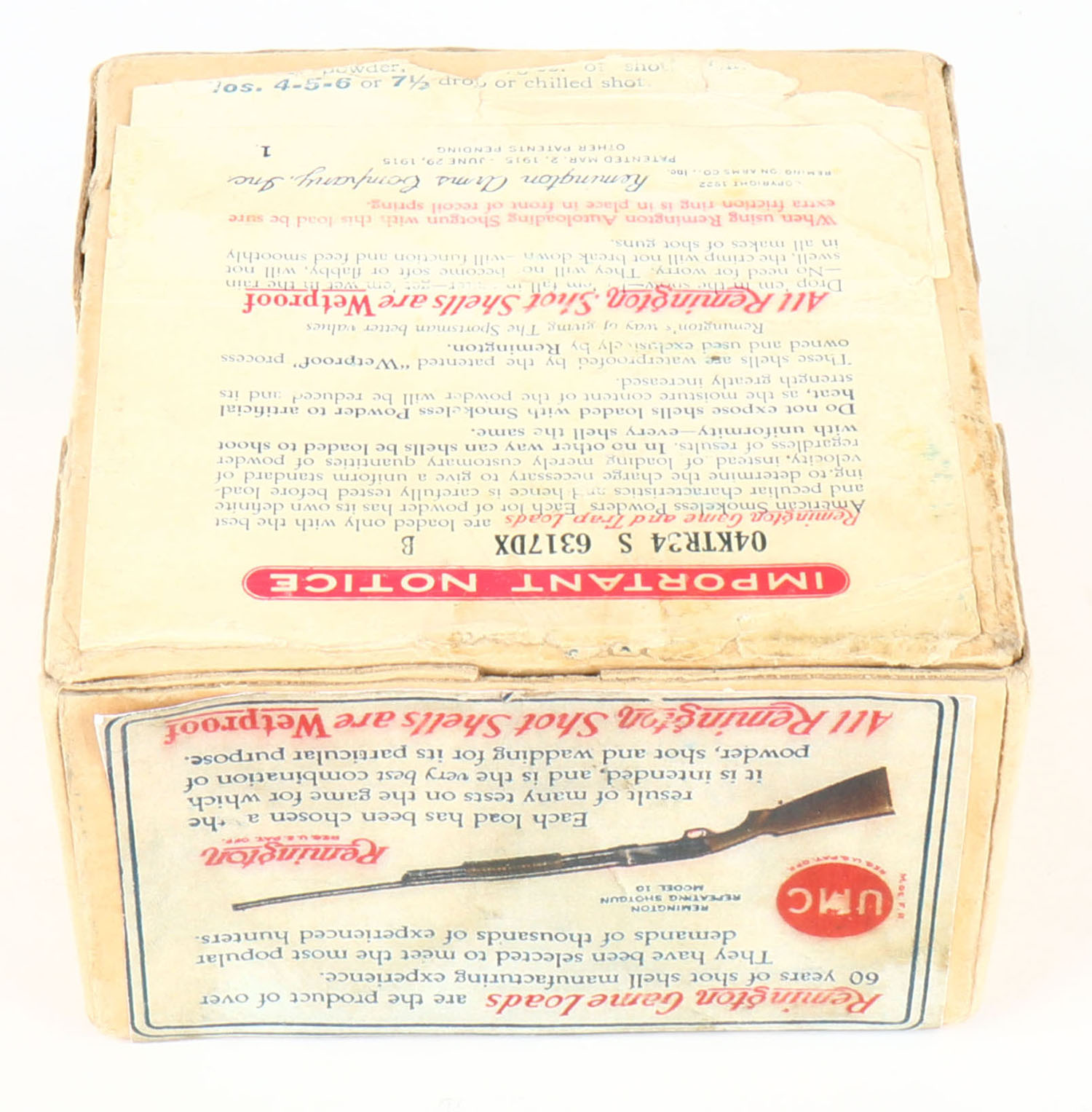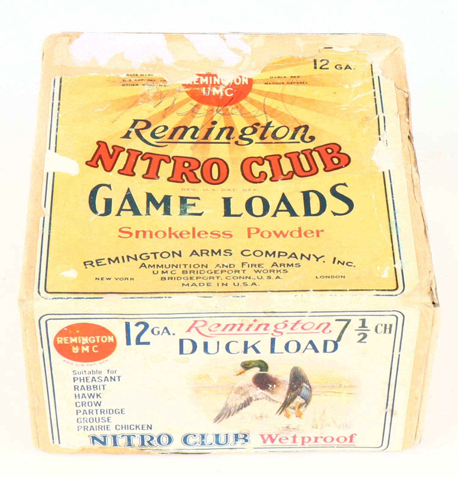 Remington UMC Nitro Club, GAME LOADS, DUCK LOAD, 12ga., 2pc., Empty, shot size 7 1/2, buff box with sunburst logo & Mallard Landing on side, box has light age soiling with edge wear, side label picturing gun is not original, label is 80% intact. Grade: Very Good - Value: 80 to 250