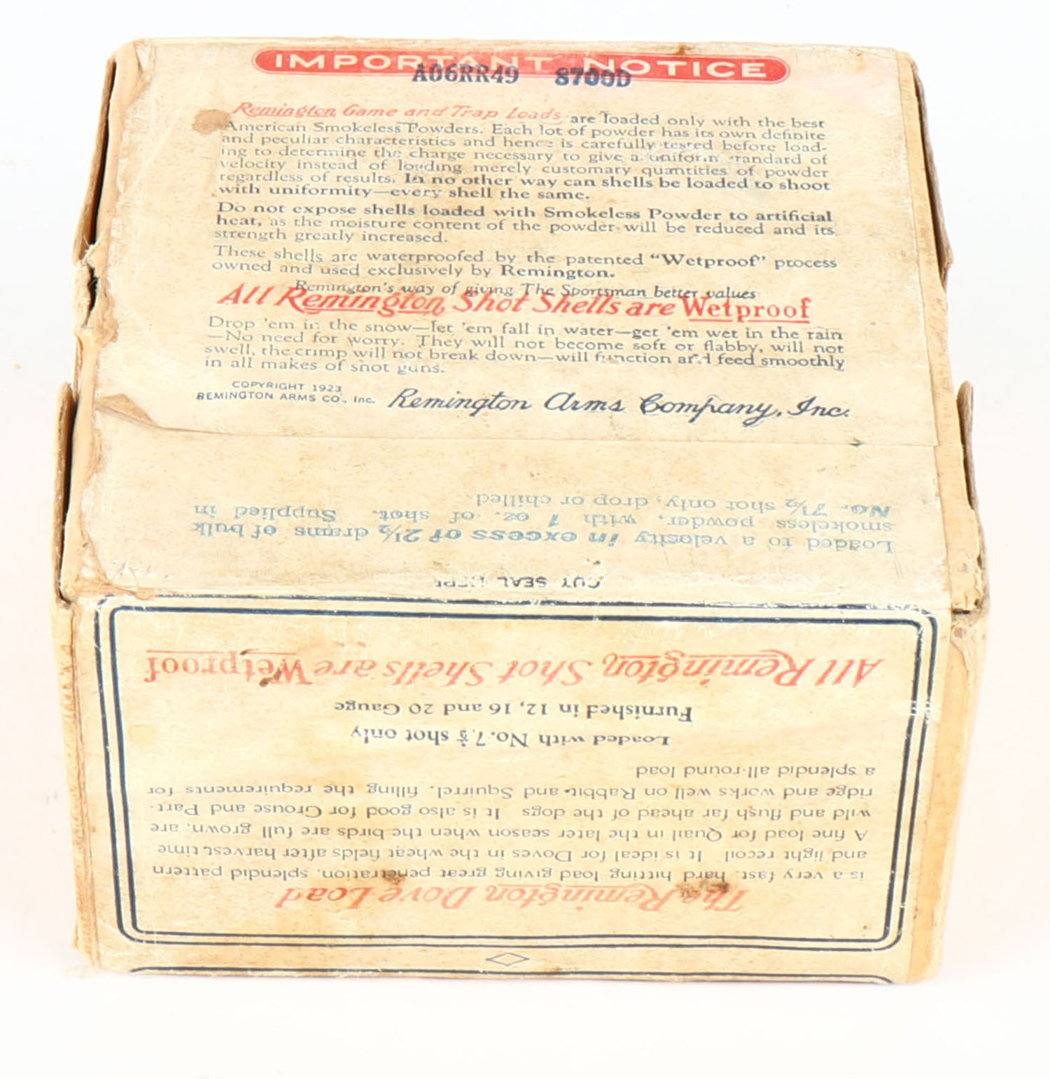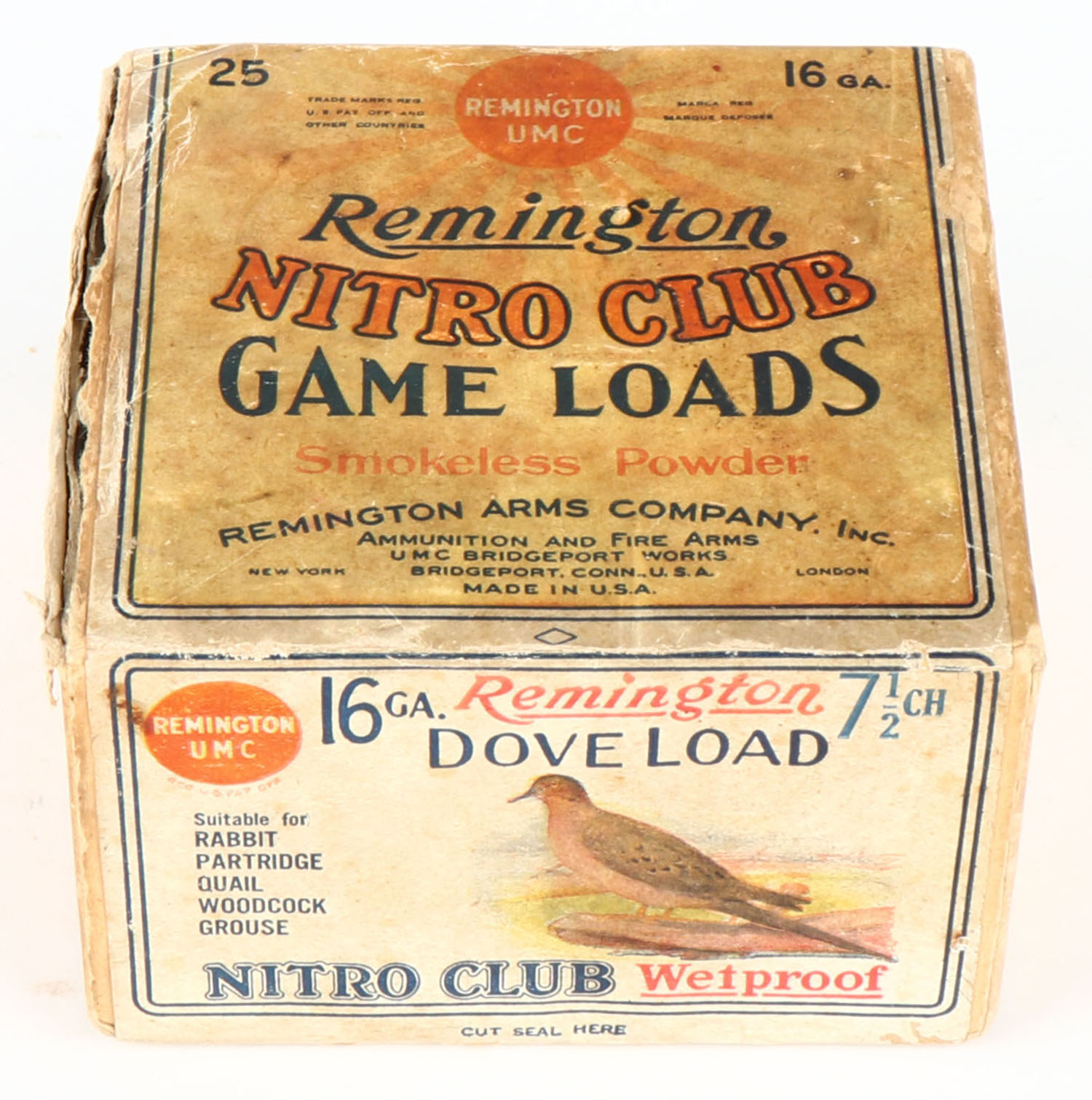 Remington UMC Nitro Club, GAME LOADS, DOVE LOAD, 16ga., 2pc., FULL & SEALED, shot size 7 1/2 Ch., buff box with sunburst logo & DOVE on side, box has age soiling with a seam split, has edge & corner wear. Grade: Very Good + - Value: 200 to 1000
