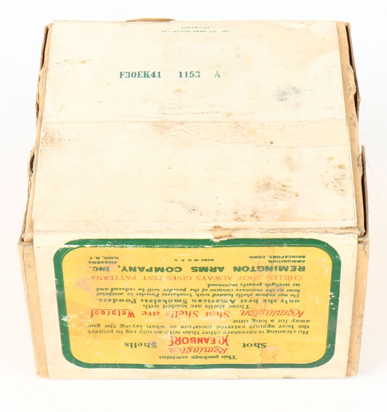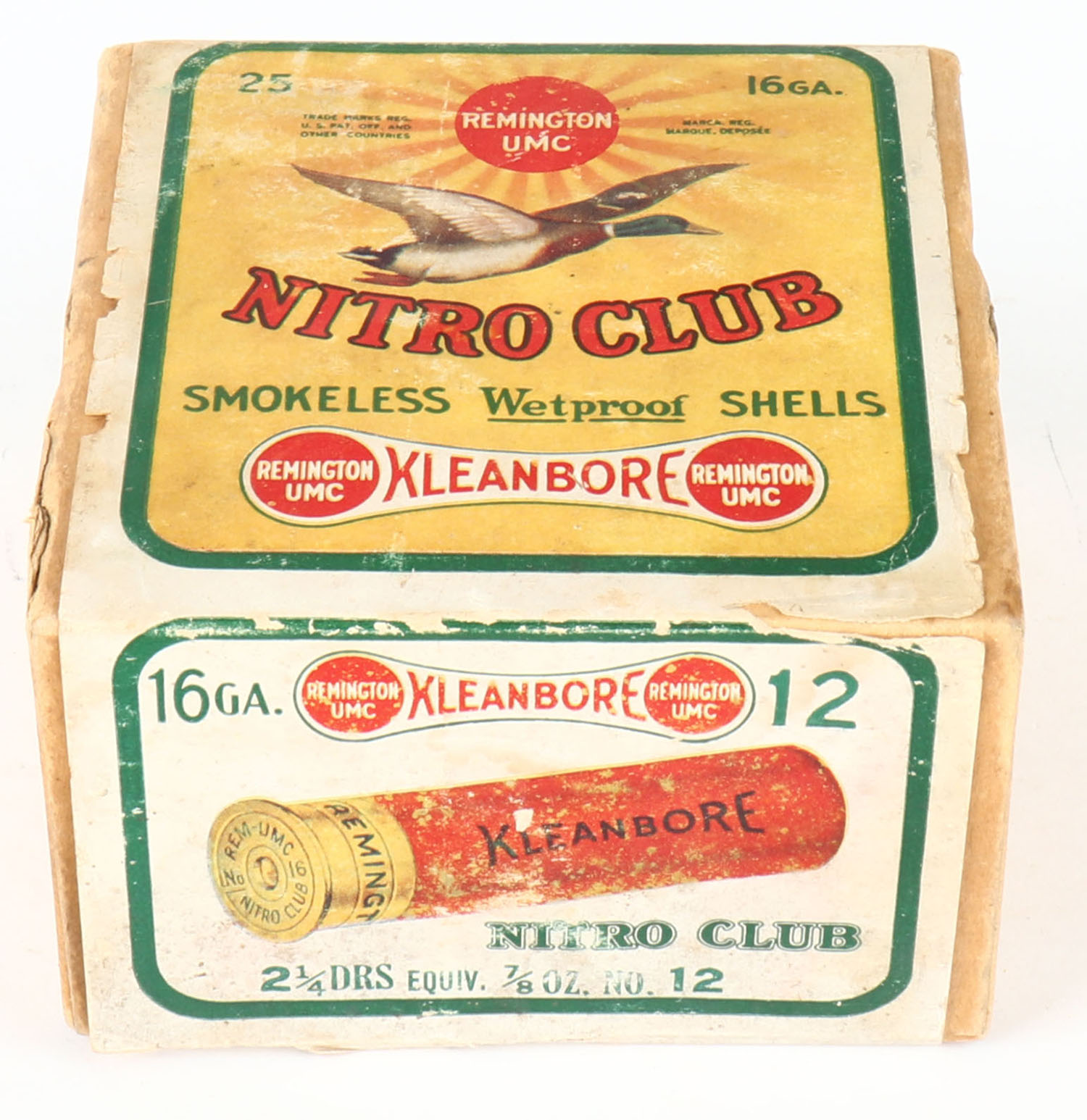 Remington UMC, Nitro Club, Kleanbore, 16ga., 2pc., FULL & SEALED, shot size 12, 2 1/4 Drs. 7/8 Oz., buff box with sunburst logo & Mallard flying on top, box has some age soiling with light scuffing. Grade: Excellent - Value: 100 to 300