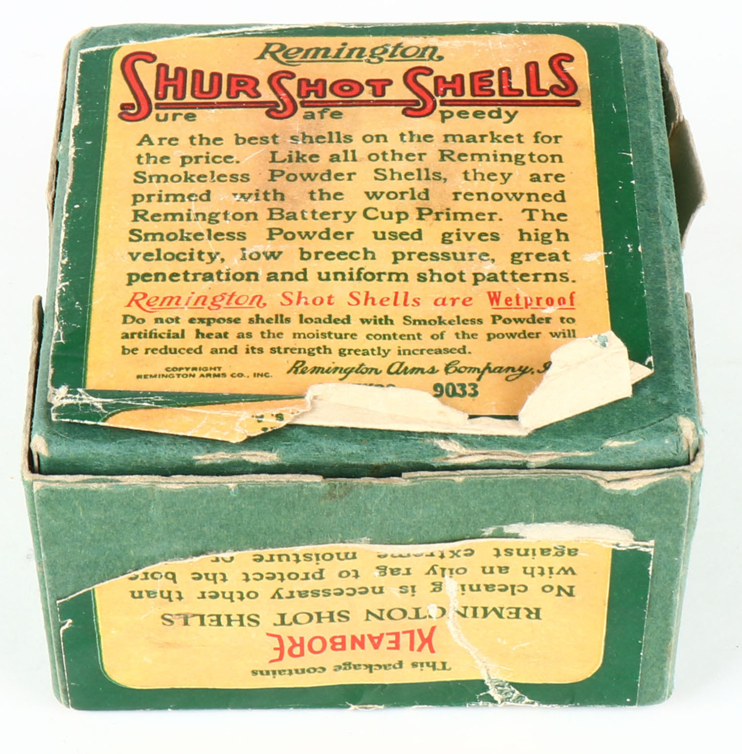Remington UMC, Shur Shot Shells, 12ga., 2pc., Partial 21rds of mixed shells, shot size 5, green box with green, yellow & red paper label, box has light age soiling with edge & corner wear, mixed shells are very good. Grade: Very Good + - Value: 20 to 140