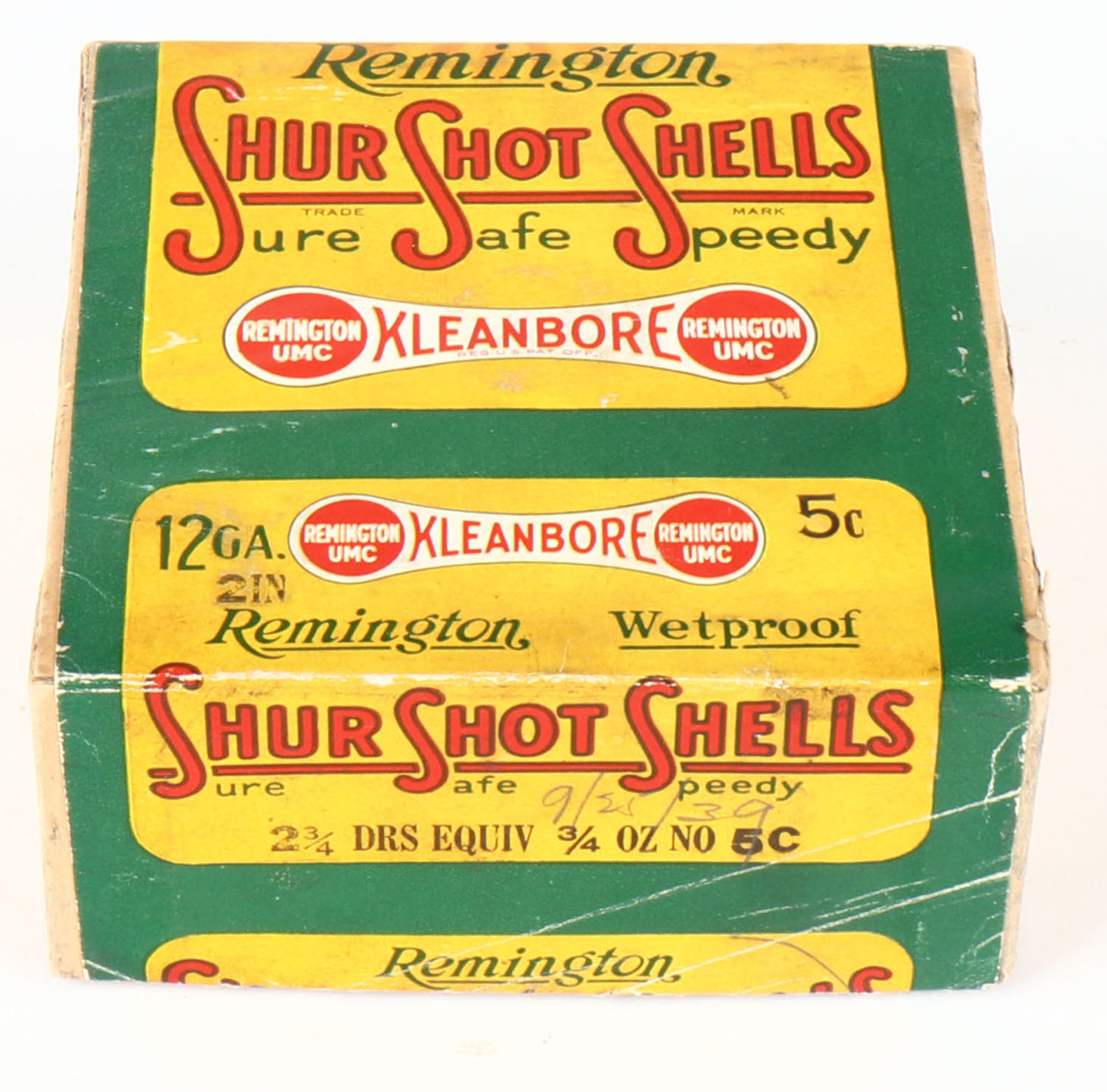 Remington UMC, Shur Shot Shells, 12ga., 2pc., Empty, shot size 5C, green box with green, yellow & red paper label, box has light scuffing with some edge wear. Grade: Very Good ++ - Value: 20 to 100