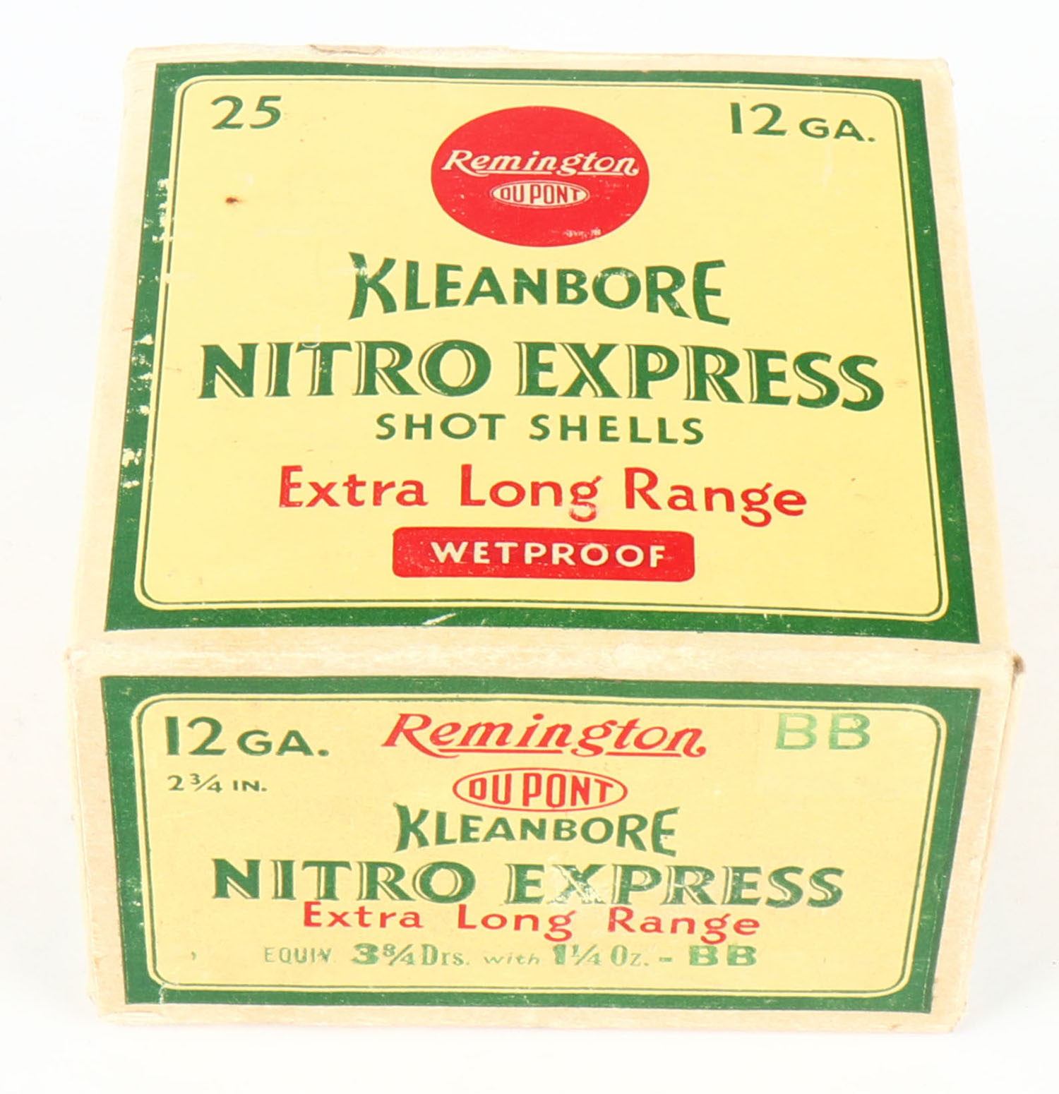 Remington Kleanbore, NITRO EXPRESS, 12ga., 1pc., Partial 20rds., shot size BB, box is buff, yellow, red and green, box is solid with minor scuffing, paper shells are excellent. Grade: Excellent - Value: 20 to 60
