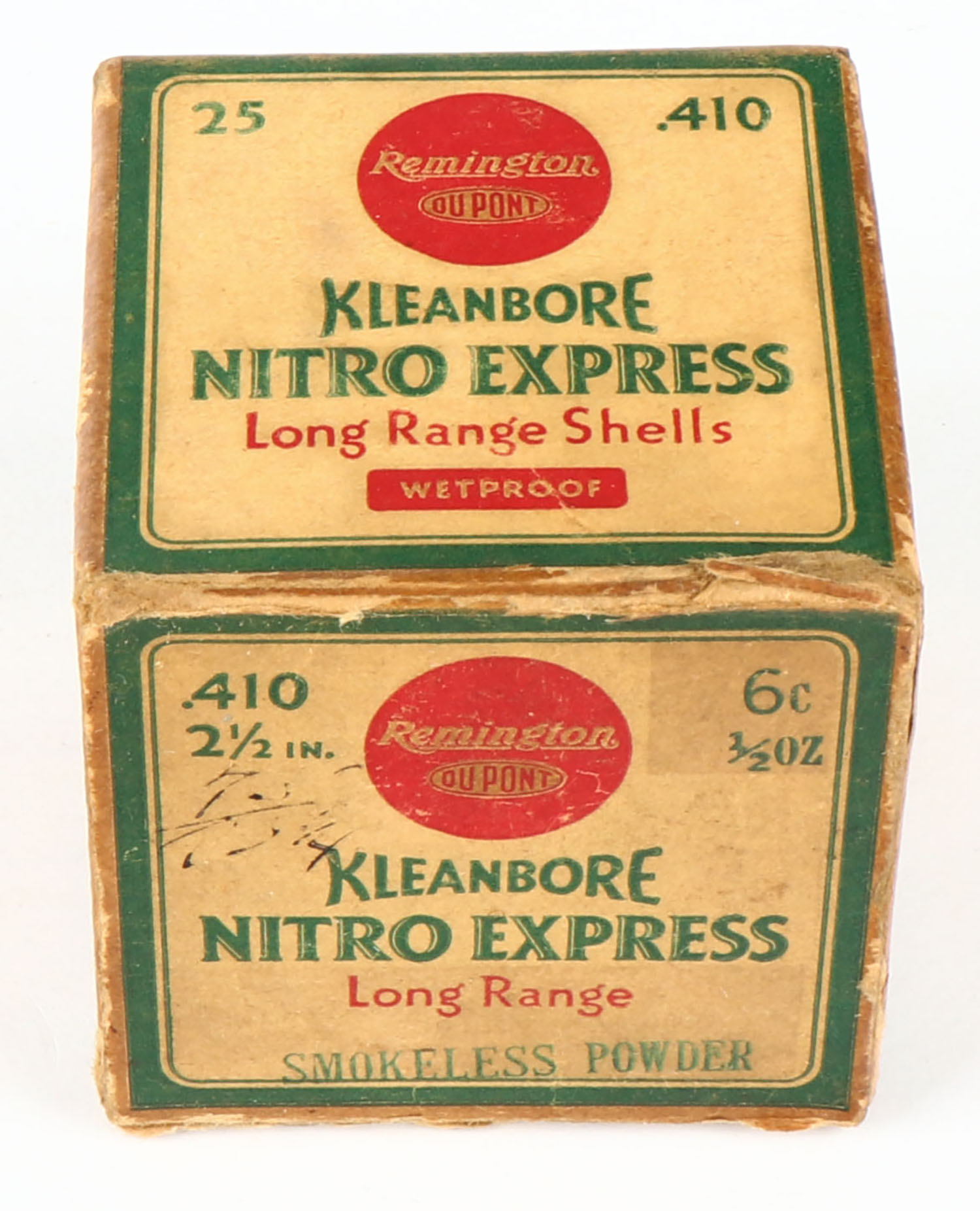 Remington, Kleanbore, NITRO EXPRESS, 410ga., 1pc., Partial 22rds. With 5 being correct shot size, shot size 6C, 2 1/2'', box is yellow, red and green, box has age soiling & scuffing, paper shells are good. Grade: Good ++ - Value: 10 to 40