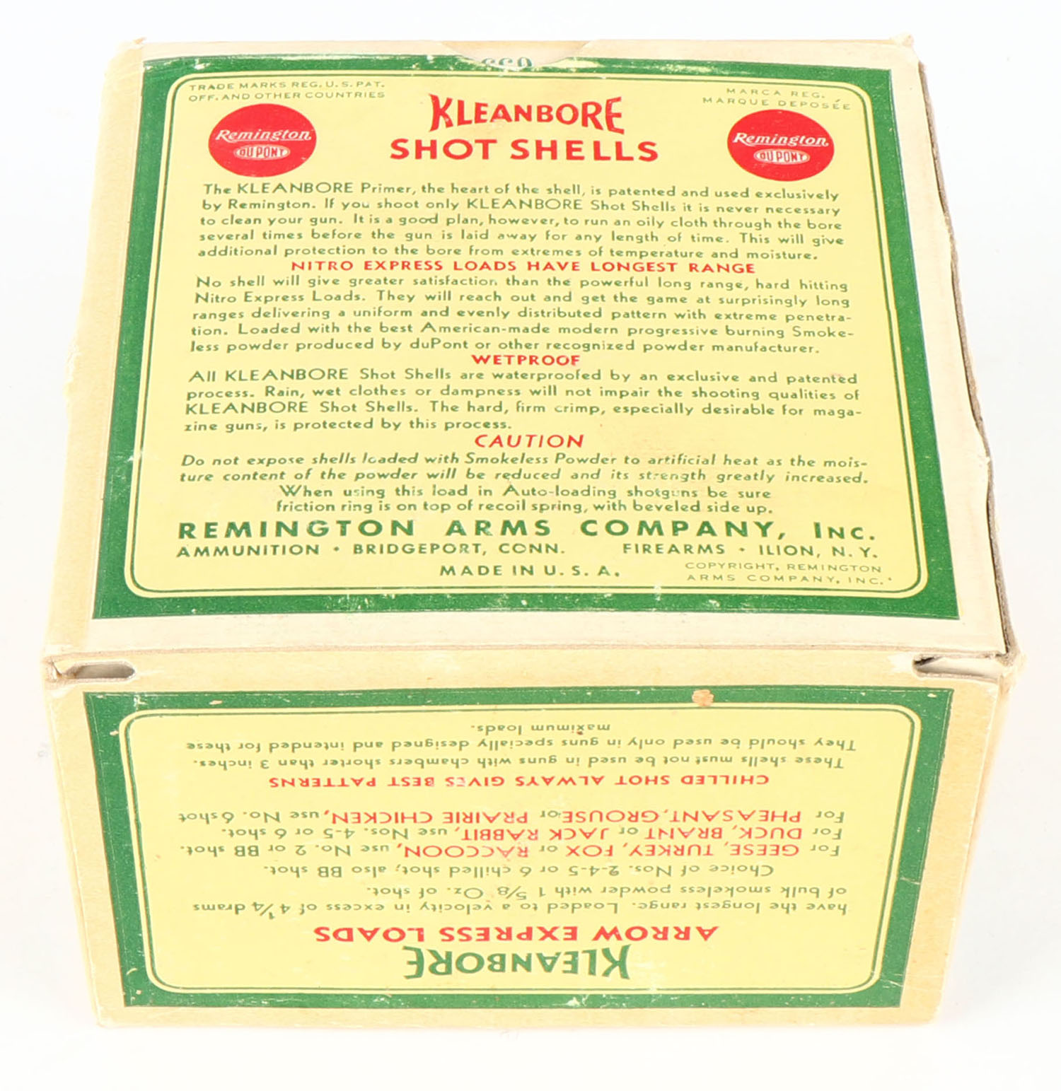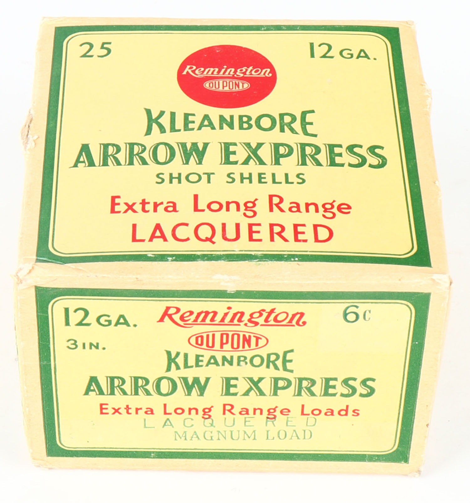 Remington, Kleanbore, ARROW EXPRESS, 12ga., 1pc., Full, shot size 6C, box is yellow, red and green, box is very solid with great colors, has light shell protrusion, paper shells are minty. Grade: Excellent + - Value: 20 to 80