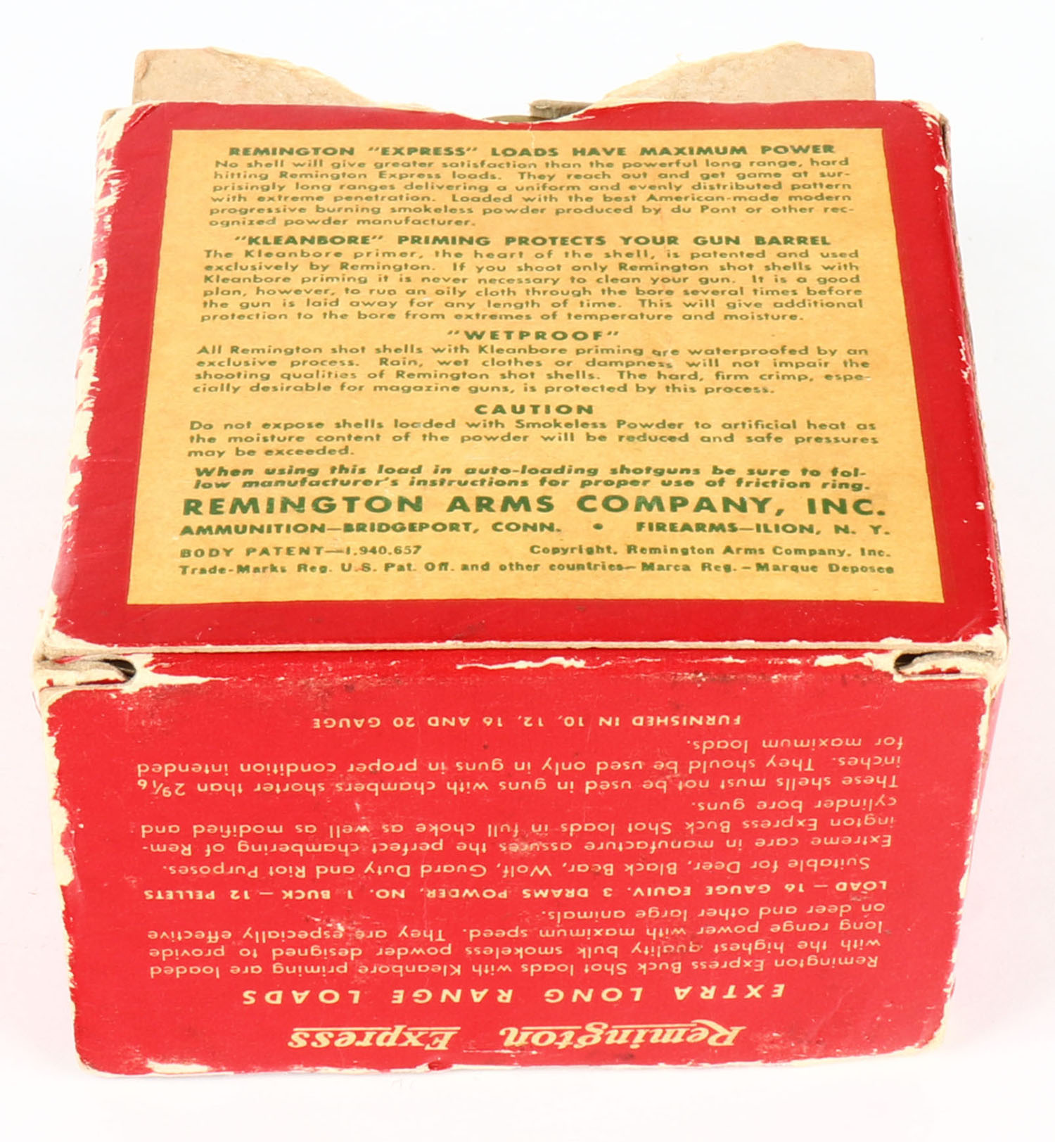 Remington Express, Extra Long Range, 16ga., 2 9/16'', 1pc., Full, shot size 1 Buck, box is red, green, and yellow, box has partially torn bottom flap, paper shells are very good. Grade: Good ++ - Value: 10 to 30