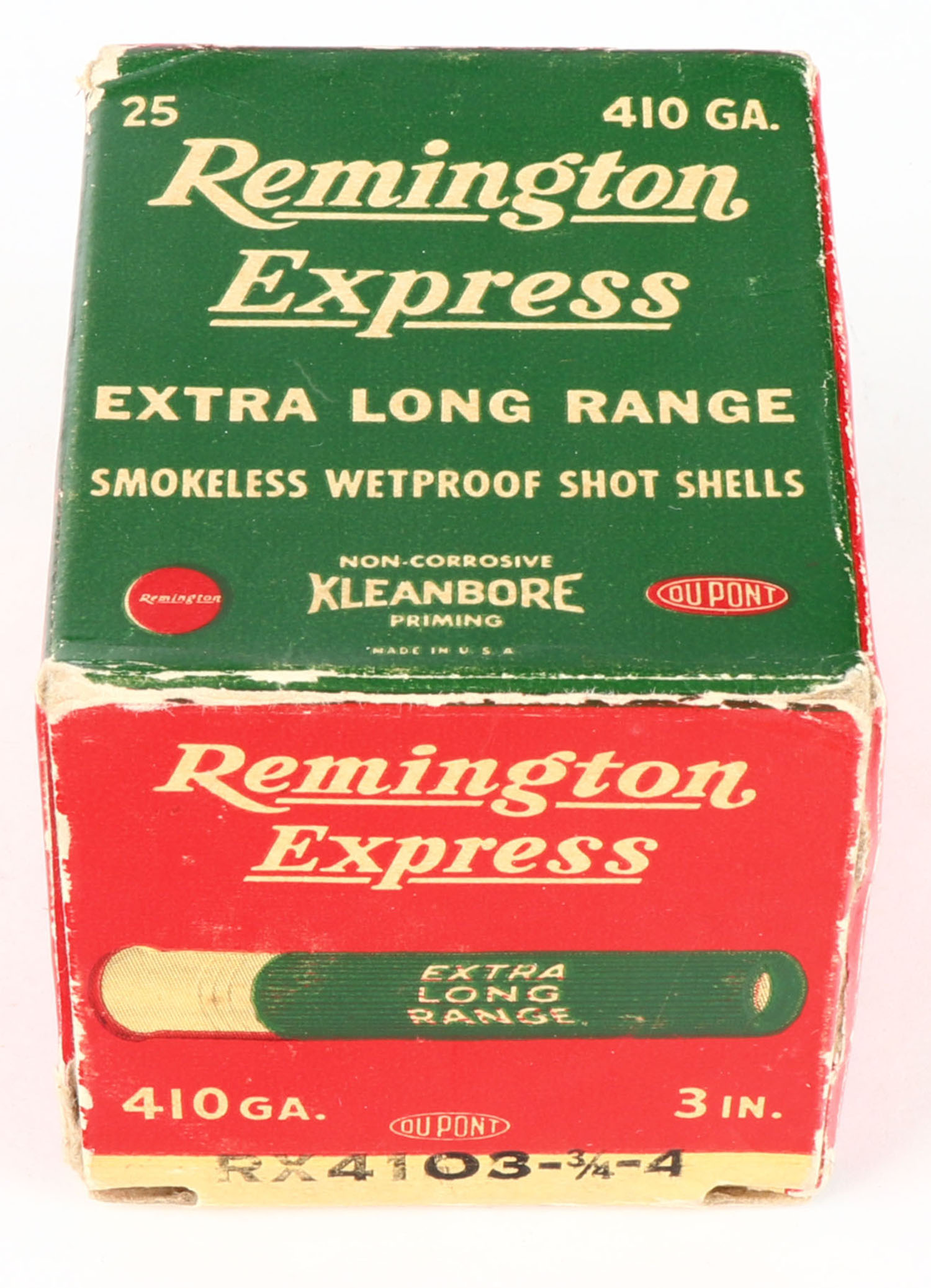 Remington Express, Extra Long Range, 410ga., 3'', 1pc., Full, shot size 4, box is white, yellow, red and green, box is very solid with light edge wear, paper shells are excellent. Grade: Excellent - Value: 10 to 50