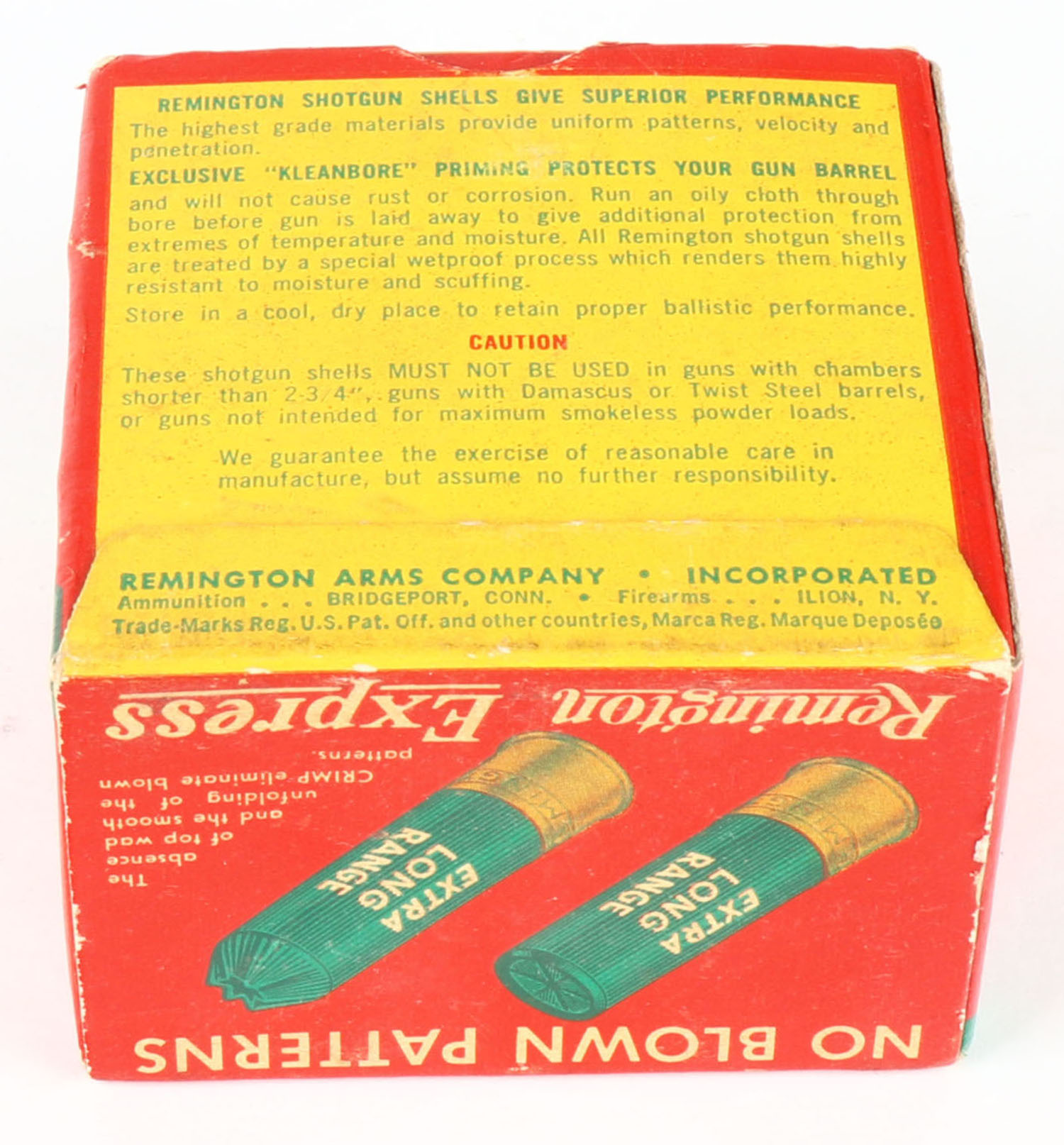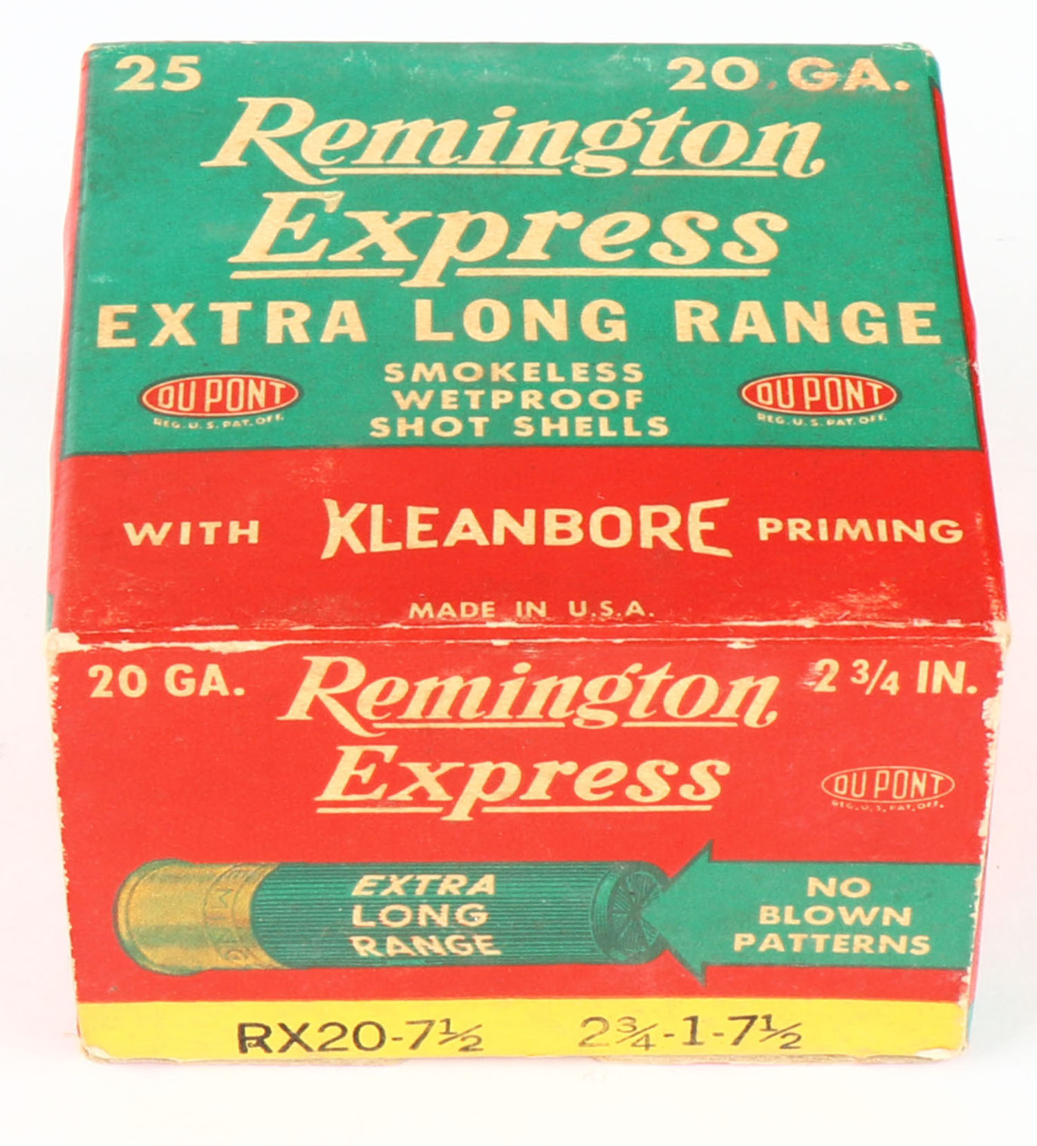 Remington Express, Extra Long Range, 20ga., 1pc., 2 3/4'', Full, shot size 7 1/2, red, white and green box, box is very solid with excellent color, paper shells are excellent. Grade: Excellent + - Value: 10 to 40