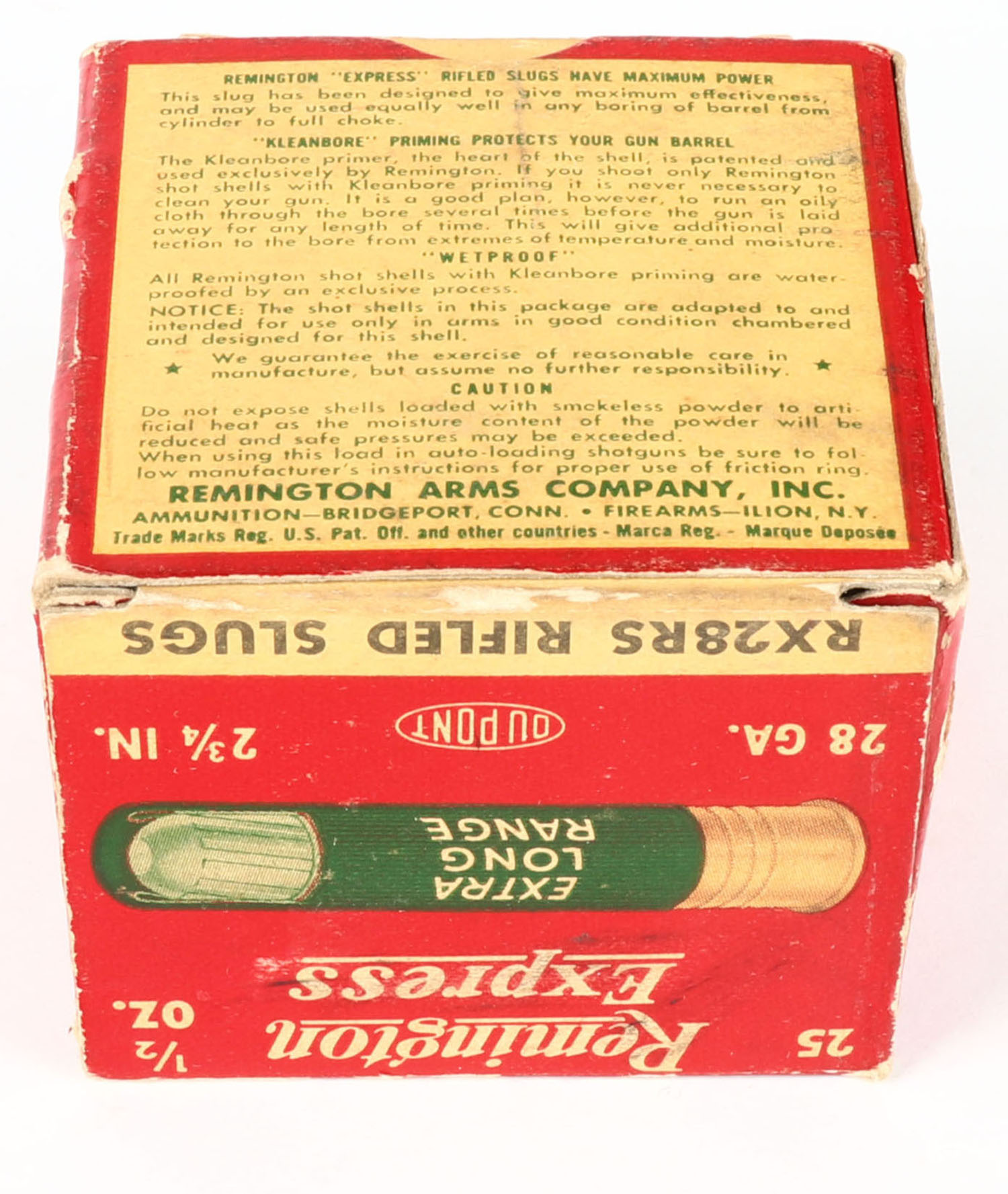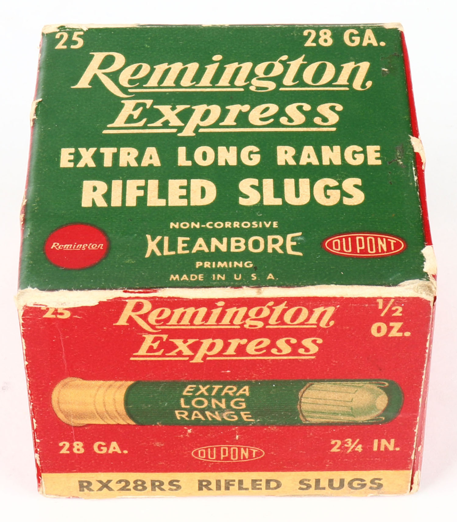 Remington Express, Extra Long Range, 28ga., 2 3/4'', 1pc., Full, shot size Rifled Slugs, box is white, yellow, red and green, box has edge wear, paper shells are excellent. Grade: Excellent - Value: 30 to 150