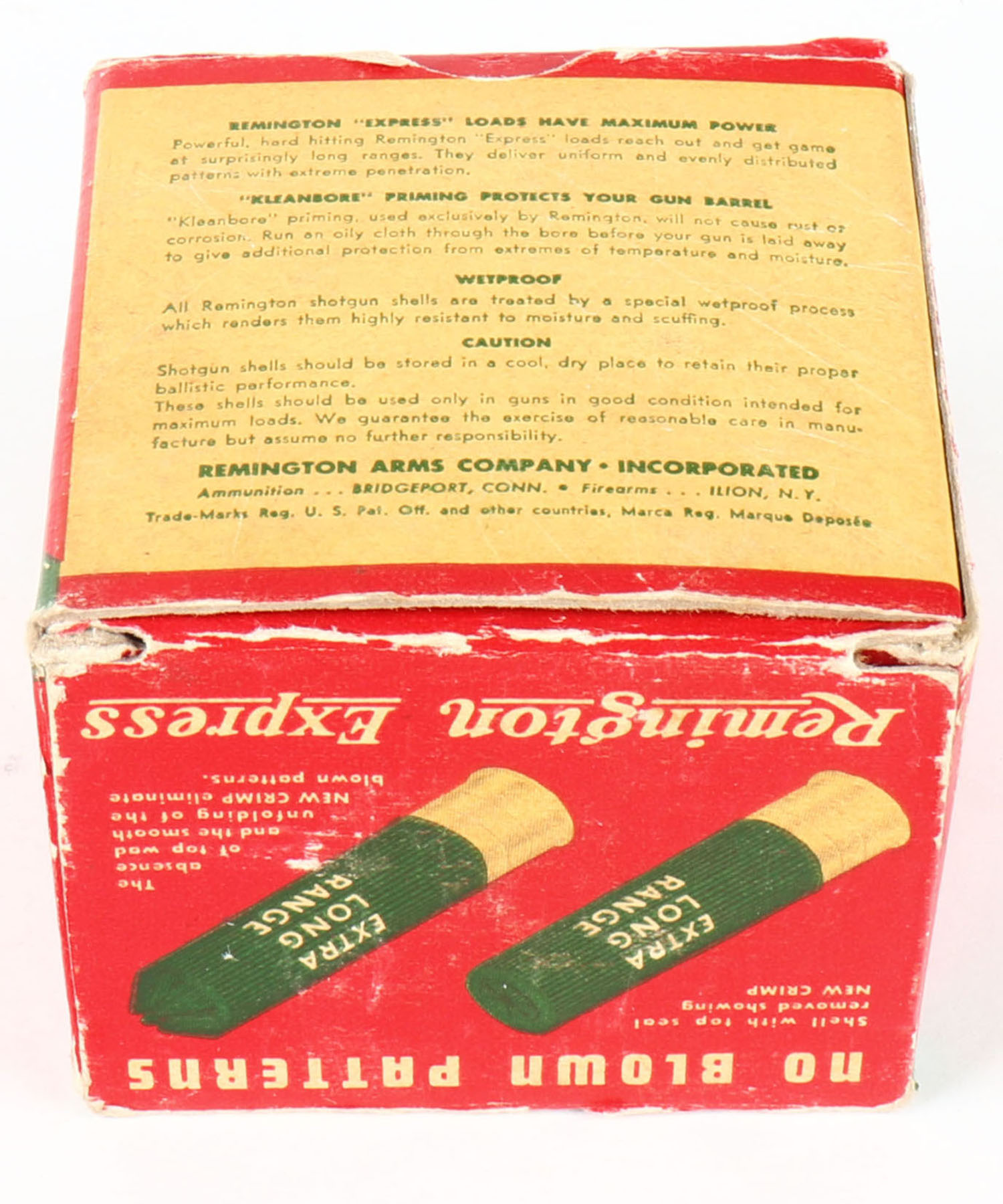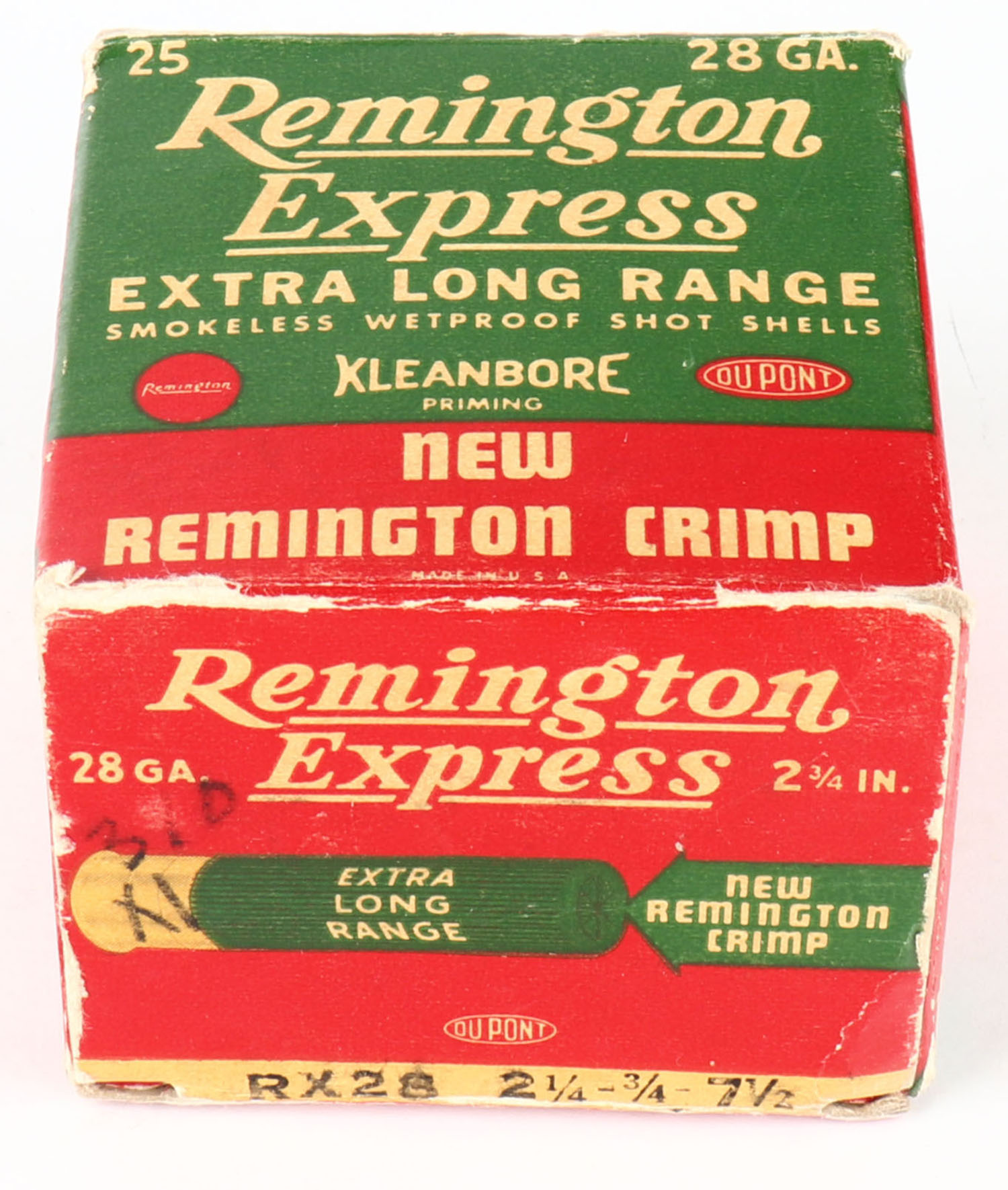 Remington Express, Extra Long Range, 28ga., 2 3/4'', 1pc., Partial 23rds., shot size 7 1/2, box is white, yellow, red and green, box has edge & corner wear, paper shells are very good. Grade: Very Good ++ - Value: 10 to 40