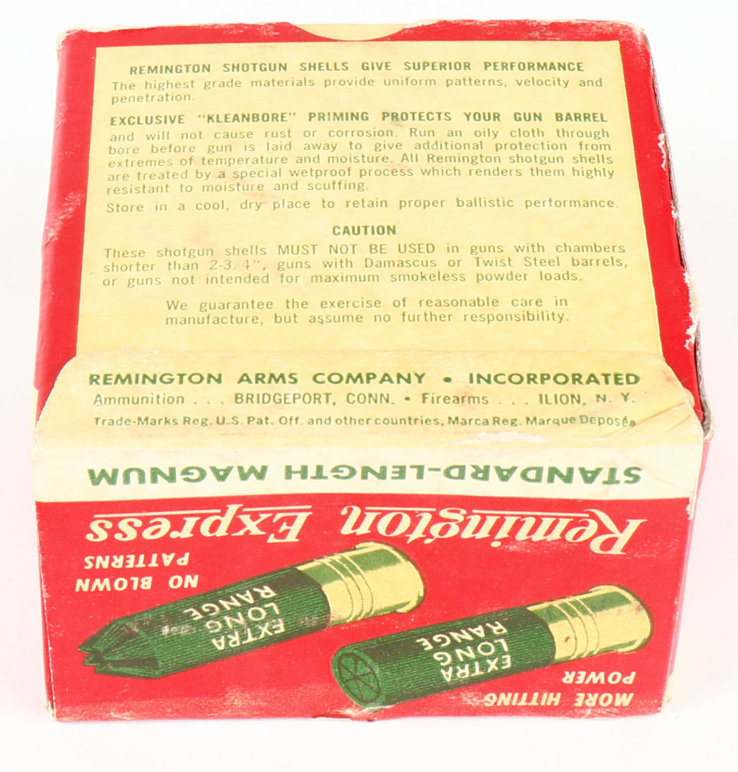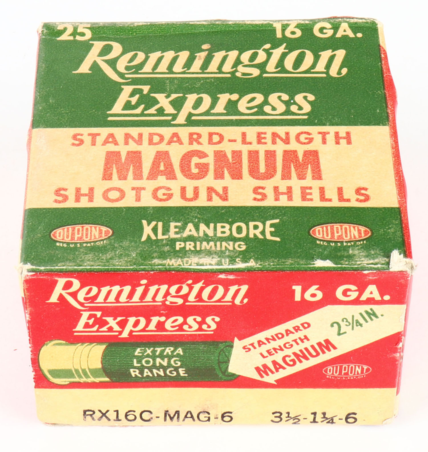 Remington Express, Standard Length Magnum, 16ga., 2 3/4'', 1pc., Full, shot size 6, box is red, white and green, box is very solid with great colors, paper shells are excellent. Grade: Excellent - Value: 10 to 40